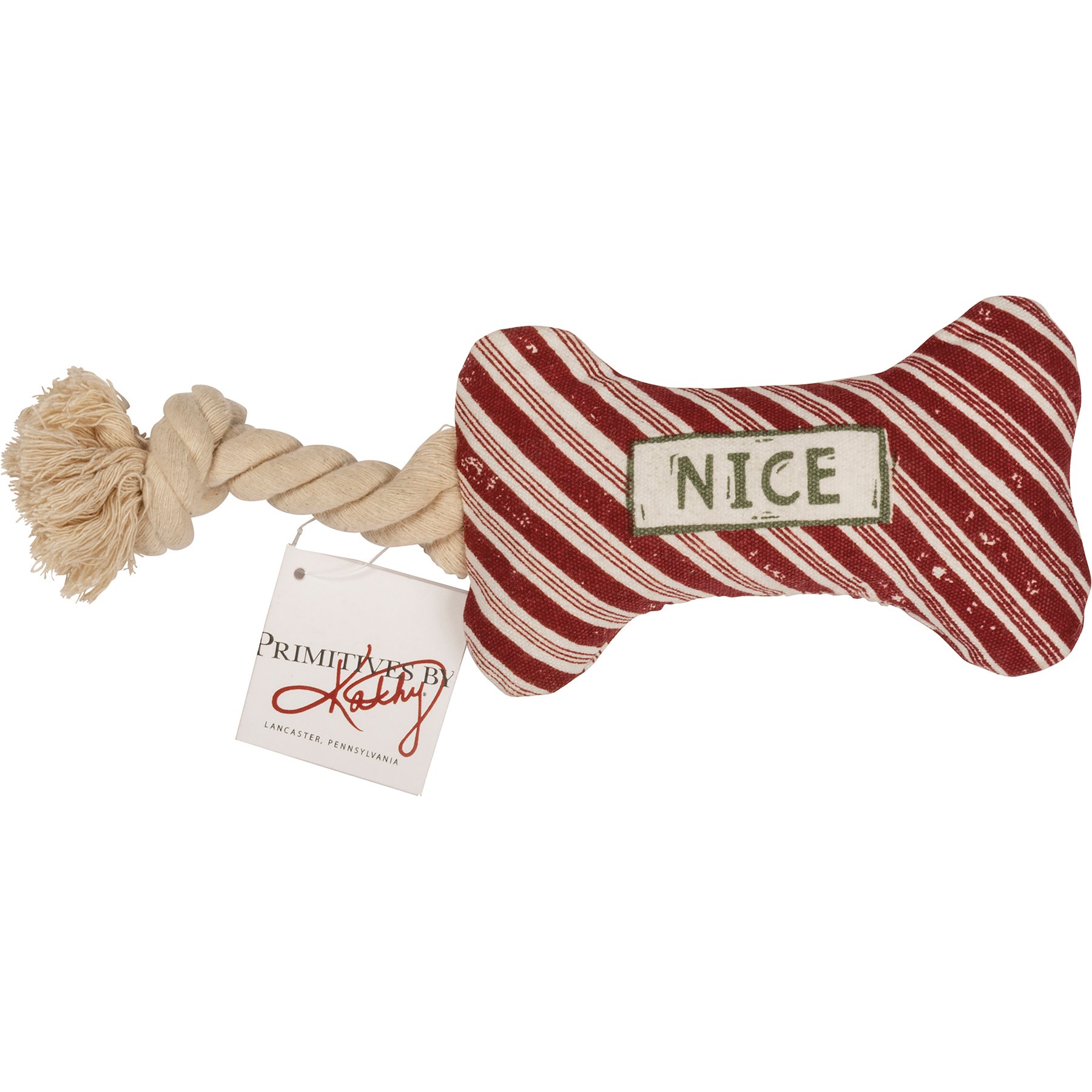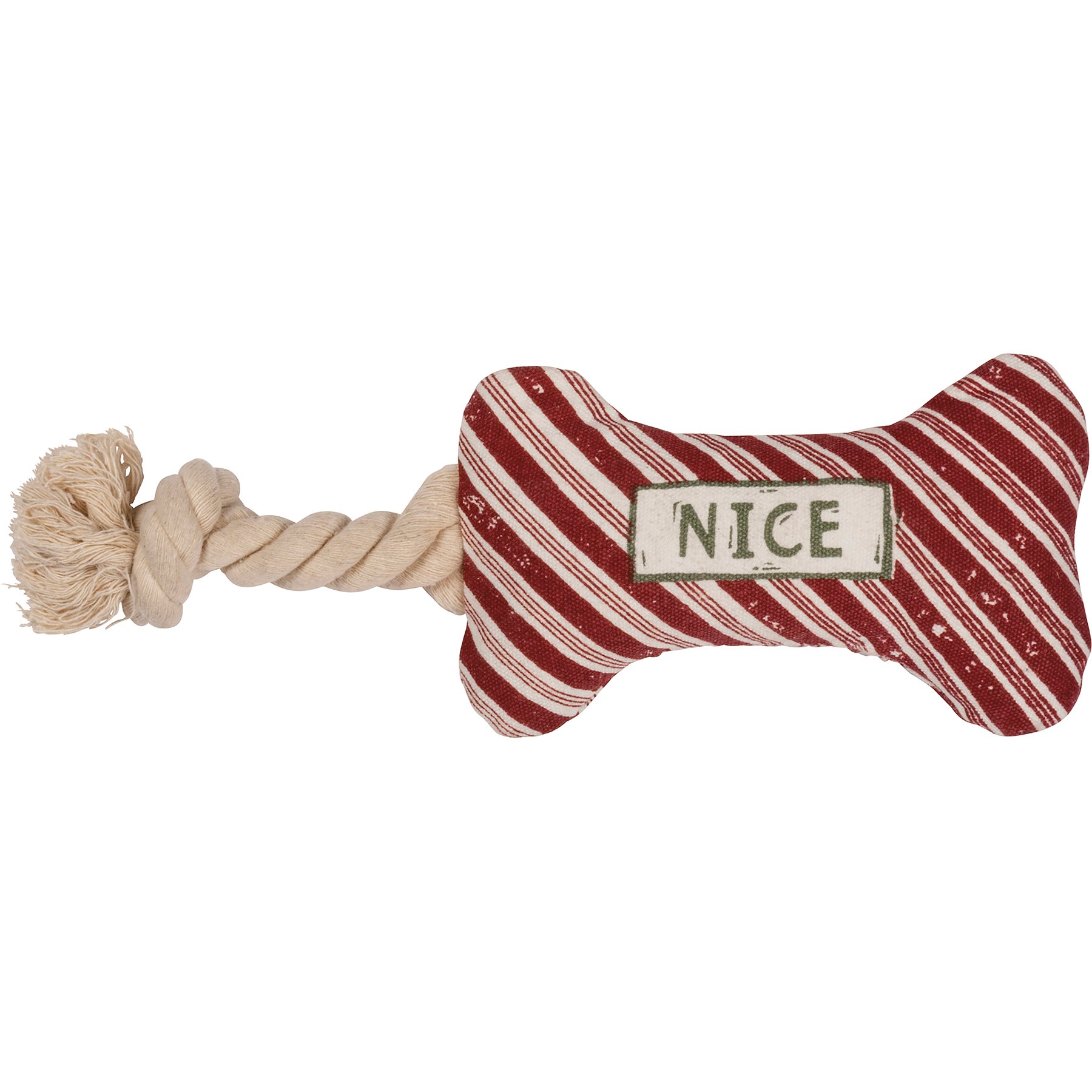 A double-sided cotton dog toy with attached rope element from our Pet Collection features a candy stripe design on both sides with "Nice" sentiment on one side and "Naughty" sentiment on other side. This Dog Bone Toy makes a crinkle sound.
