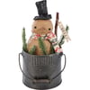 A classic primitive snowman doll from our Christmas Collection displaying a snowman wearing a knit scarf and hat sitting in a metal bucket with faux greenery and a sign that says "Brrrr!" Doll is recreated from an original handmade piece with wood, fabric, and snowy details. Our Let It Snow doll is designed to free-stand on any flat surface. Contains small parts; this is not a toy. A charming seasonal home accent to display alone or as a collection with other dolls.
