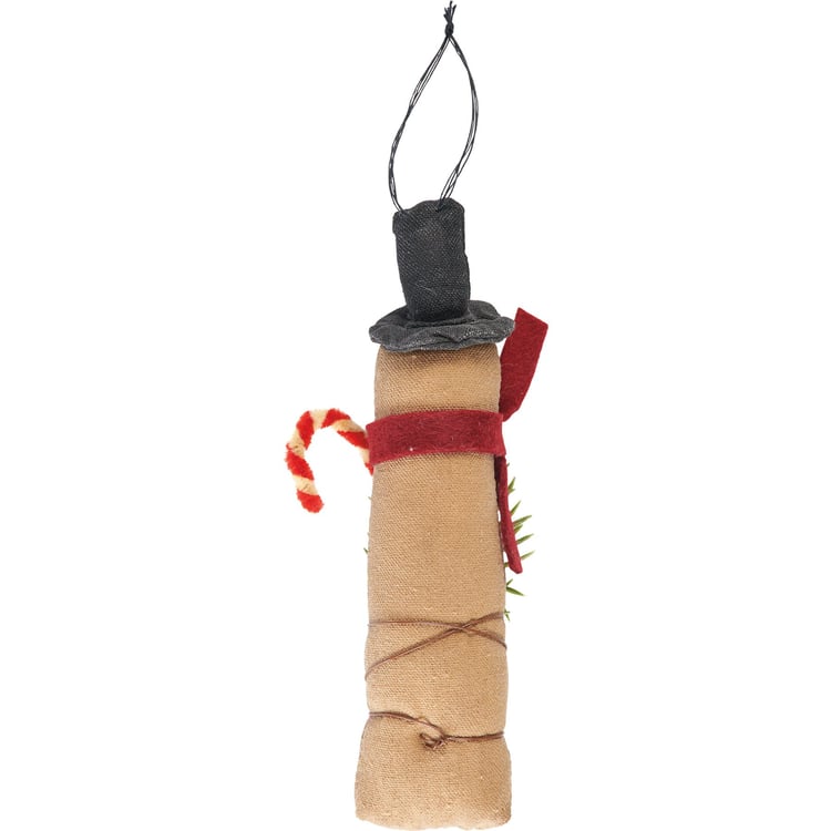 A primitive snowman doll from our Christmas Collection displaying a slender snowman wearing a scarf and hat sitting with candy cane and Christmas bell. Doll is recreated from an original handmade piece with metal wire and wood details. Our Skinny Snowman doll is designed to hang via hanger attached to hat. Contains small parts; this is not a toy. A charming seasonal home accent to display alone or as a collection with other dolls.