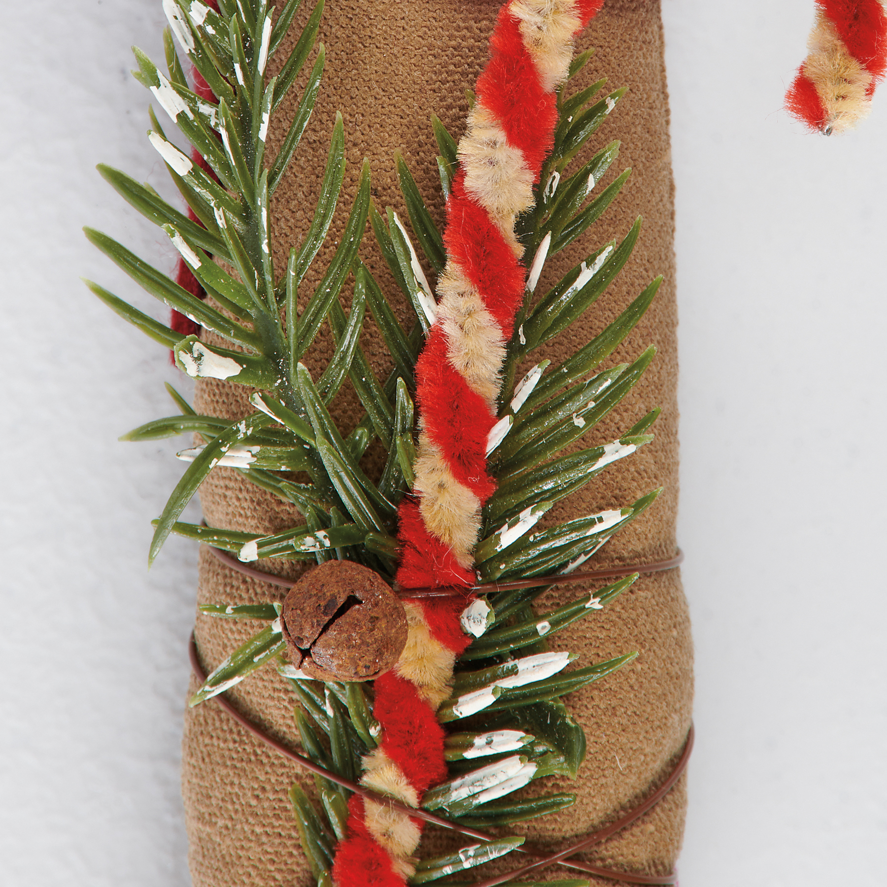 A primitive snowman doll from our Christmas Collection displaying a slender snowman wearing a scarf and hat sitting with candy cane and Christmas bell. Doll is recreated from an original handmade piece with metal wire and wood details. Our Skinny Snowman doll is designed to hang via hanger attached to hat. Contains small parts; this is not a toy. A charming seasonal home accent to display alone or as a collection with other dolls.