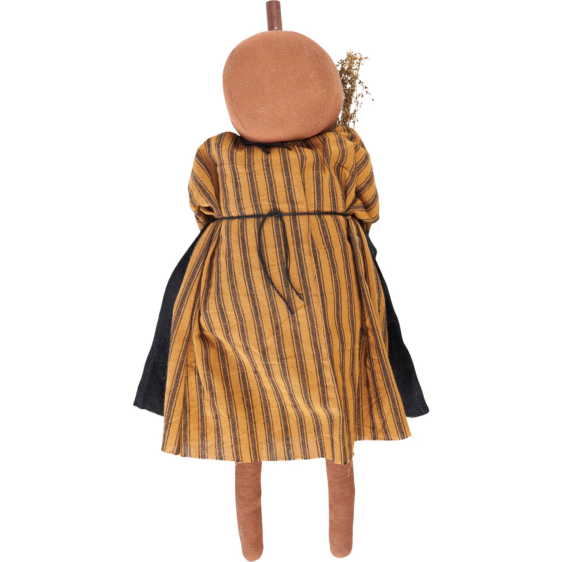 A classic primitive pumpkin doll from our Halloween Collection named Spooky Sally wearing fall clothes and wooden bead necklace that says "Spooky" while holding fall foliage. Doll is recreated from an original handmade piece with wood and fabric details. Our Spooky Sally doll is designed to sit on any flat surface. Contains small parts; this is not a toy. A charming seasonal home accent to display alone or as a collection with other dolls.