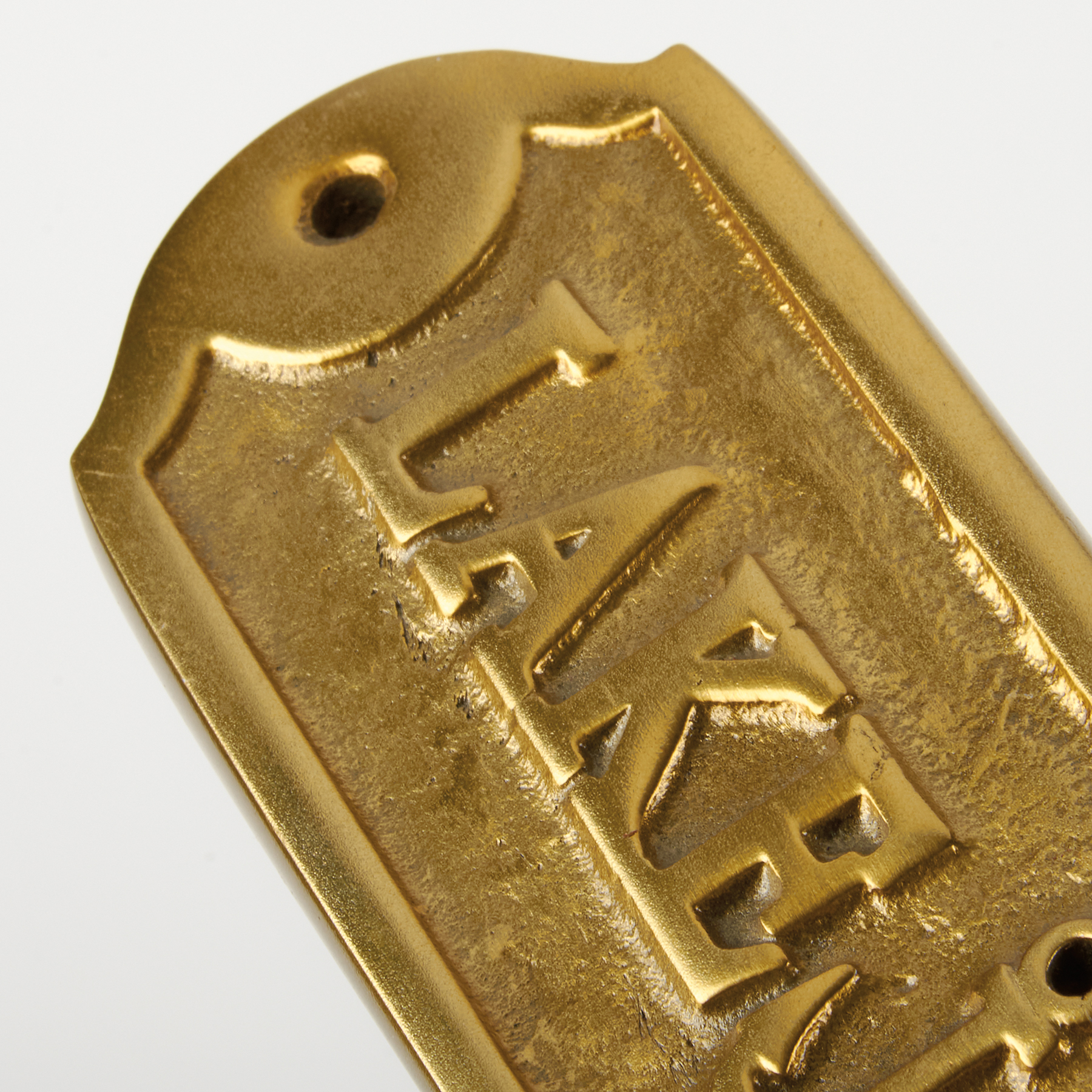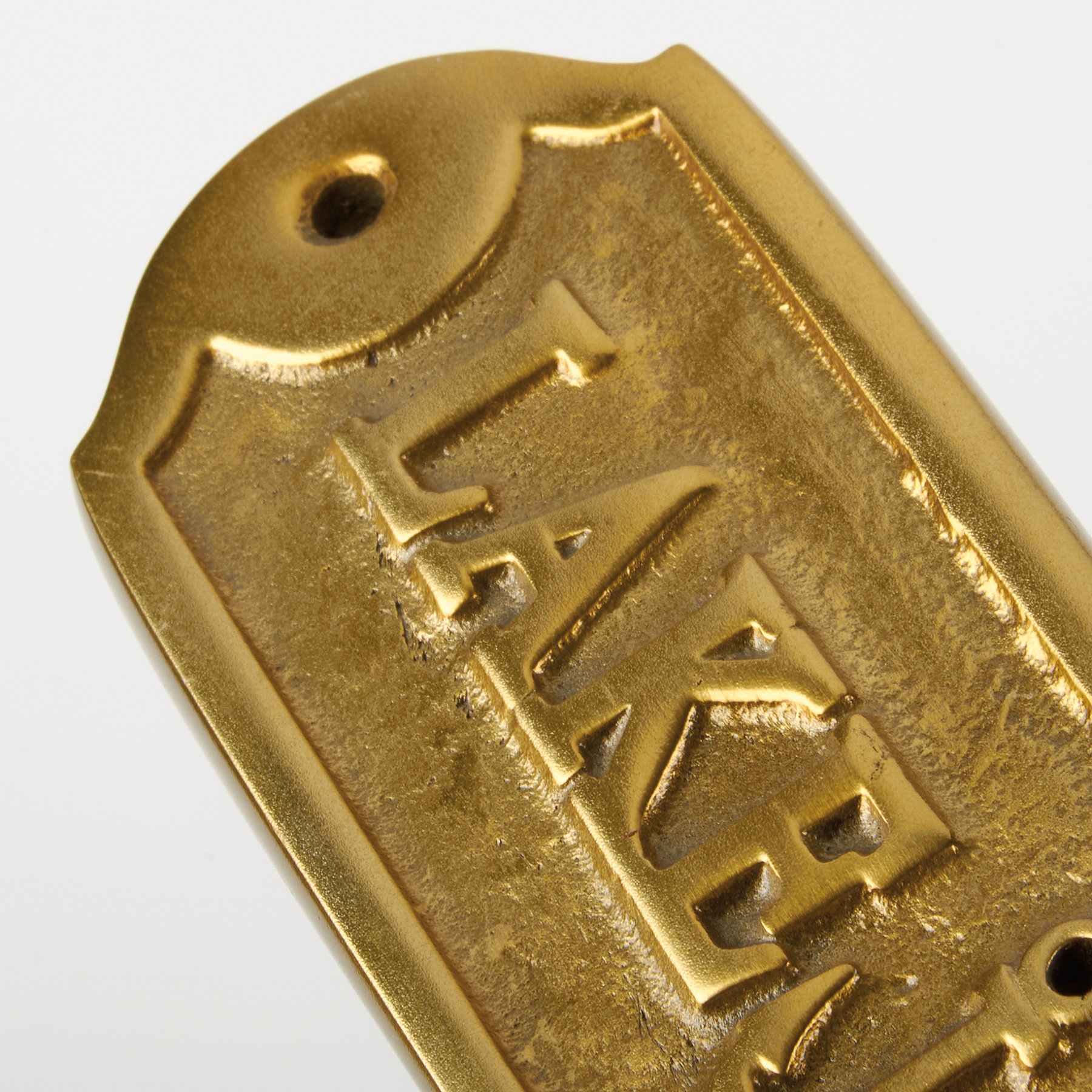 A metal door plaque from our Lake & Cabin Collection featuring an antique brass finish over a "Lake House" sentiment and anchor design. Design and sentiment is embossed for added dimension. Our Lake House door plaque is easy to hang via included hardware.