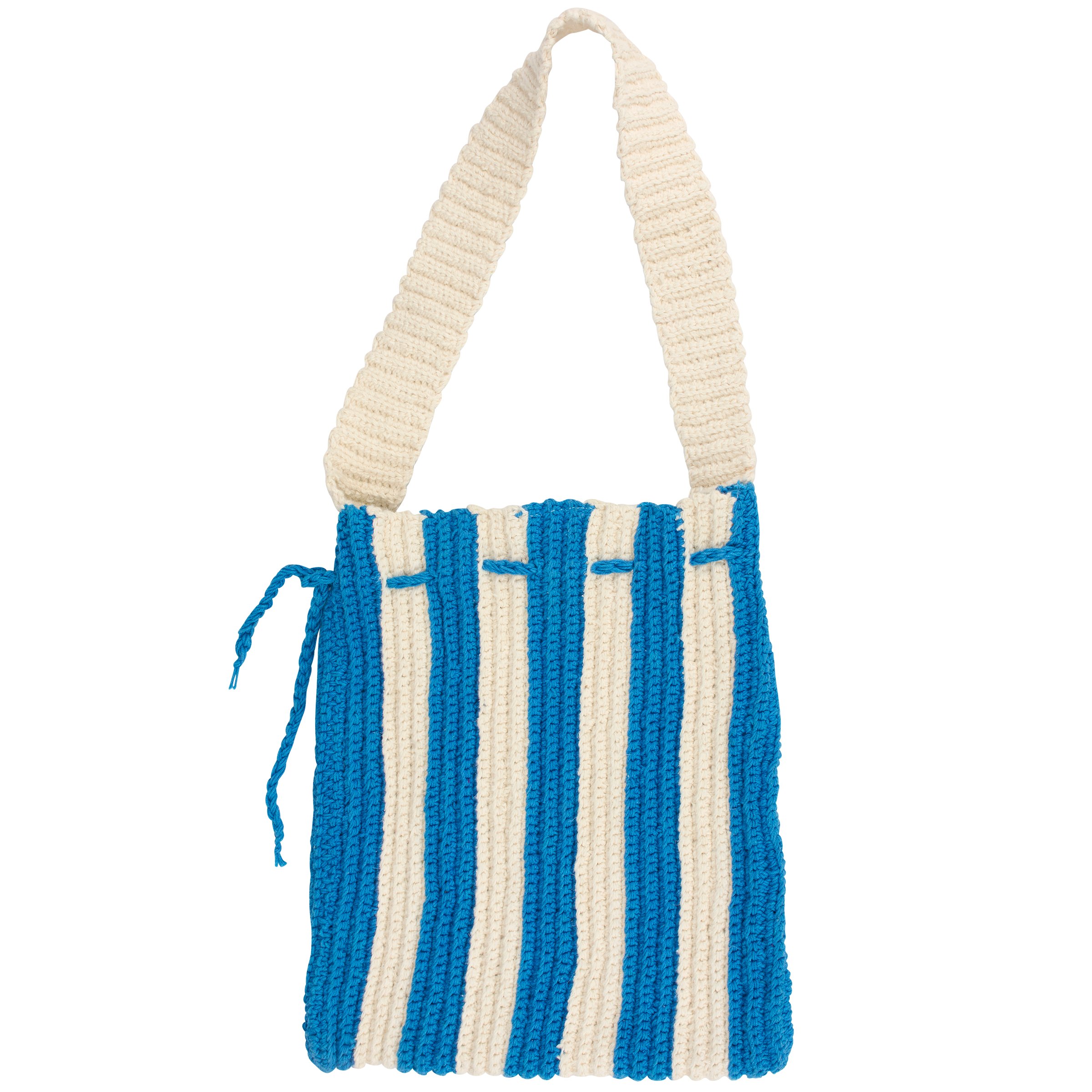 A cotton drawstring bag from our Beach Collection displaying a blue and white stripe pattern inspired by Italian coastal style. Coastal drawstring bag features a unique knit design for the shoulder strap and bag for a handmade aesthetic. Our Blue Stripe drawstring bag includes a 12 inch handle and 14 inch pouch perfect for storing everyday items when on the go. Spot clean only. A stylish everyday accessory great for gifting.