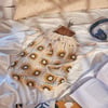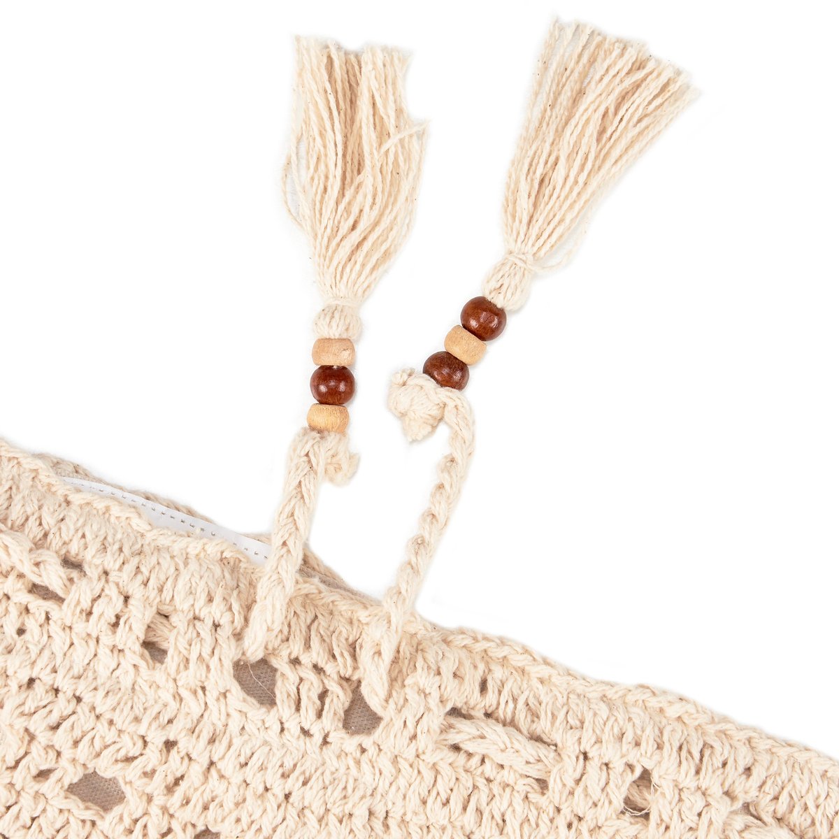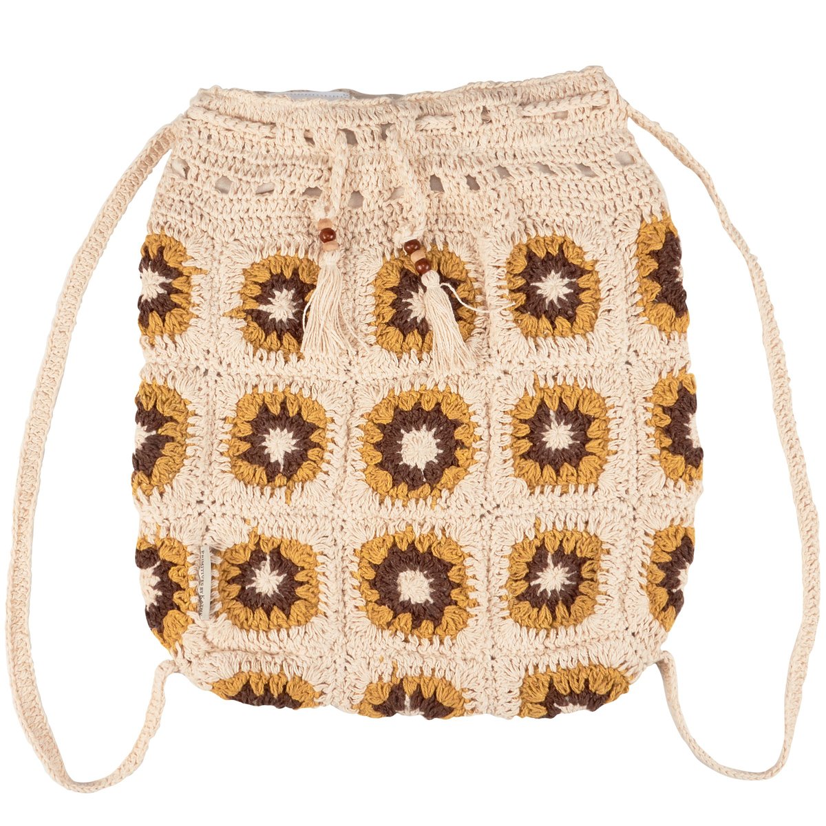 A cotton drawstring bag from our Cottagecore Collection displaying a nature inspired pattern of a sunflowers. Drawstring bag features a unique crochet style for the shoulder straps and bag design. Each end of the drawstring features wooden beads and tassels for added interest. Our Crochet Sunflower drawstring bag includes a fully lined pouch perfect for storing everyday items when on the go. Spot clean only. A stylish nature-themed accessory great for gifting.