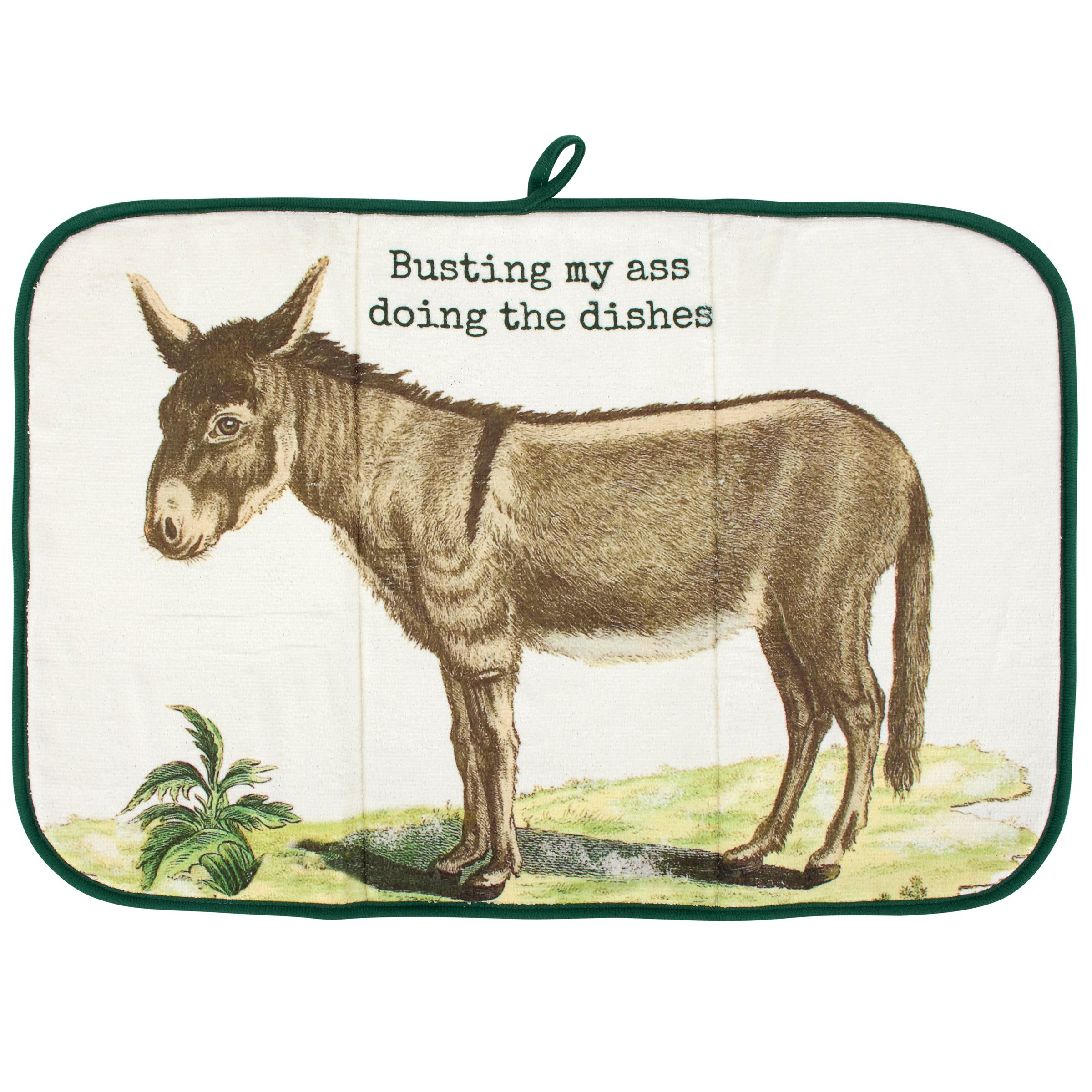 An ultra-absorbent drying mat from our Farmhouse Collection displaying vintage art of a donkey with a fun donkey themed pun that reads "Busting My Ass Doing The Dishes." Donkey drying mat features a full color design on the 21 inch by 14 inch space to place items for drying with a coordinating green color on the back and trim. Our Doing The Dishes drying mat includes a hanger at the top to display design or to air dry when not in use. Kitchen drying mat is conveniently machine-washable for easy cleaning and folds up for easy storage. A fun farm themed kitchen accessory perfect for everyday use.