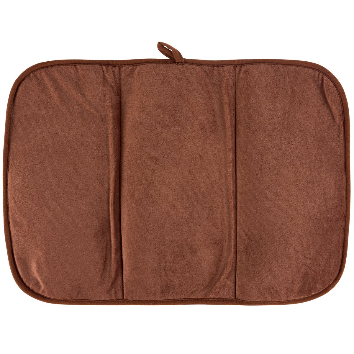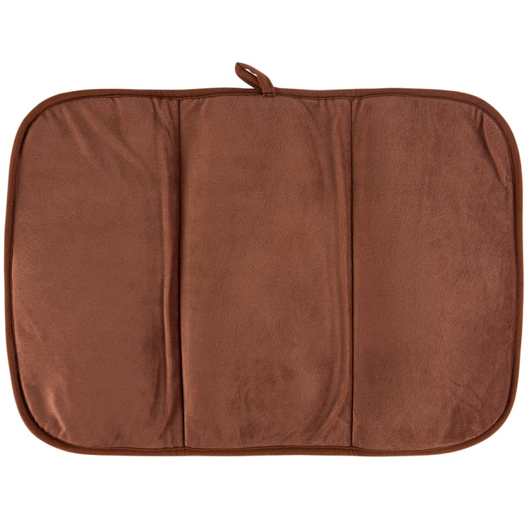 An ultra-absorbent drying mat from our Fall & Harvest Collection displaying a fall scene of a deer in the forest replicated from original artwork painted onto burlap canvas, giving the art a unique depth and texture. Fall deer drying mat features a full color design on the 21 inch by 14 inch space to place items to dry with coordinating brown color on the back and trim. Our Forest Deer drying mat includes a hanger at the top to display design or to air dry when not in use. Seasonal drying mat is conveniently machine-washable for easy cleaning and folds up for easy storage. A rustic fall kitchen accessory perfect for seasonal use.