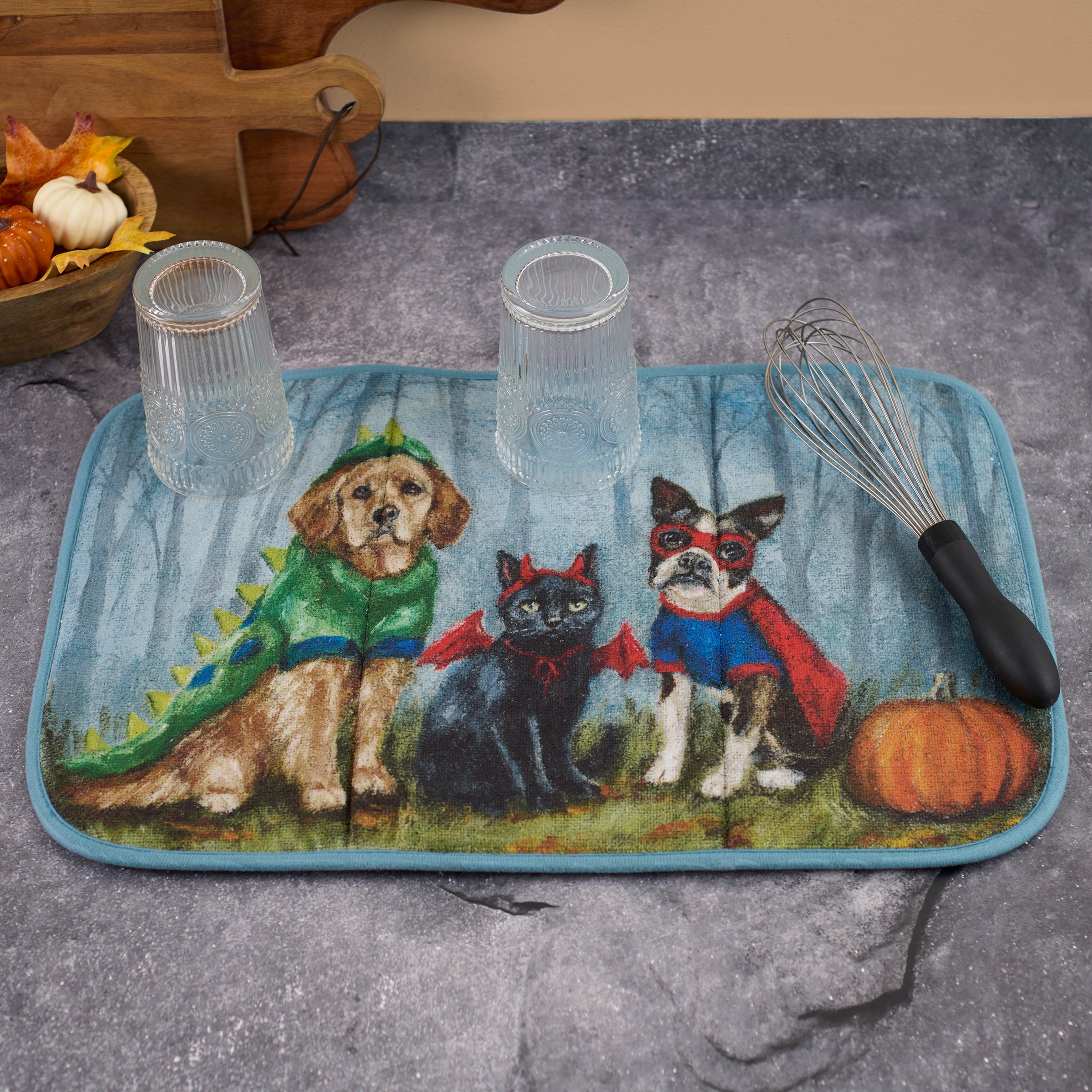 An ultra-absorbent drying mat from our Halloween Collection displaying a charming scene of pets dressed in Halloween costumes replicated from original artwork painted onto burlap canvas, giving the art a unique depth and texture. Halloween drying mat features a full color design on the 21 inch by 14 inch space to place items to dry with coordinating blue color on the back and trim. Our Halloween Family drying mat includes a hanger at the top to display design or to air dry when not in use. Seasonal drying mat is conveniently machine-washable for easy cleaning and folds up for easy storage. A fun pet-themed Halloween kitchen accessory perfect for seasonal use.
