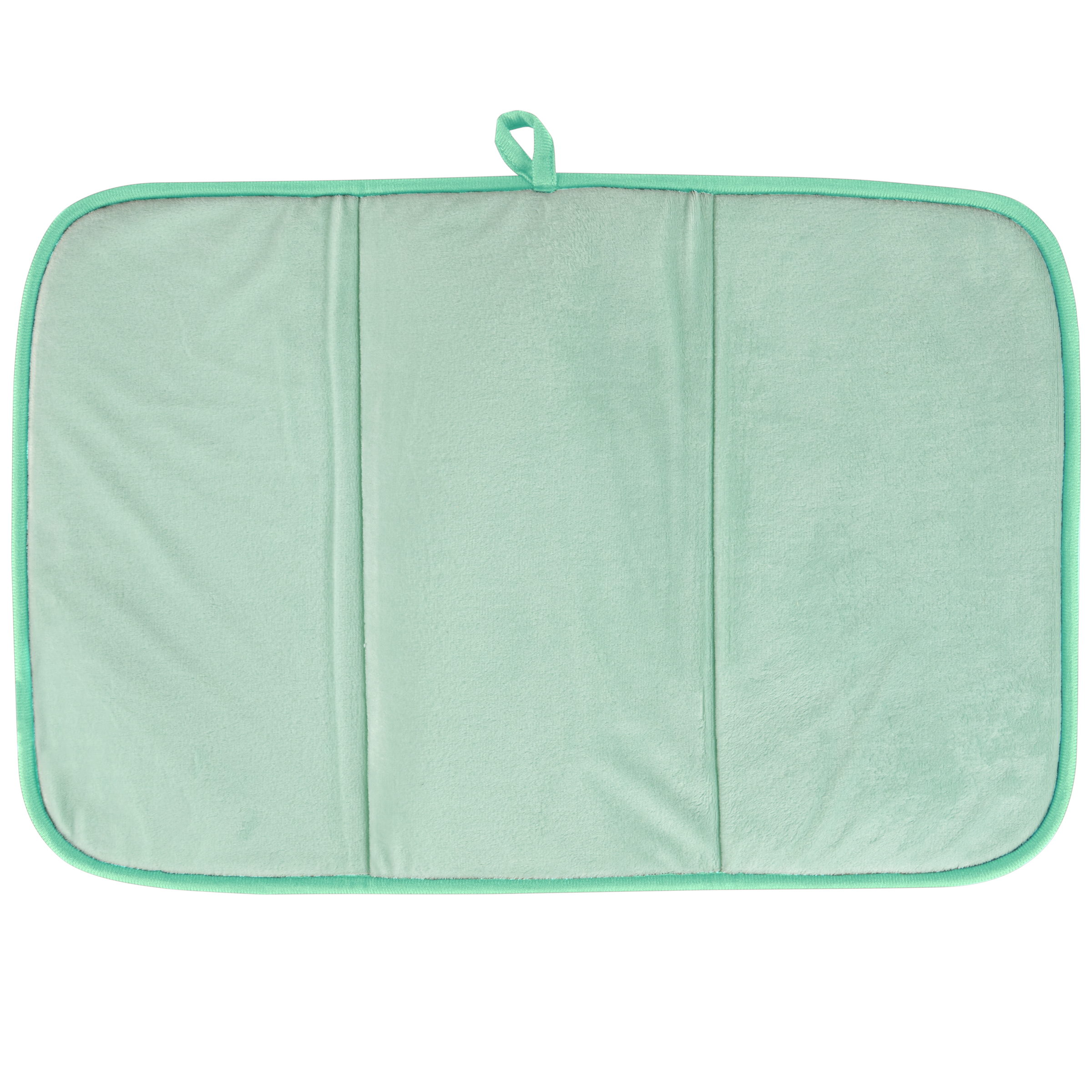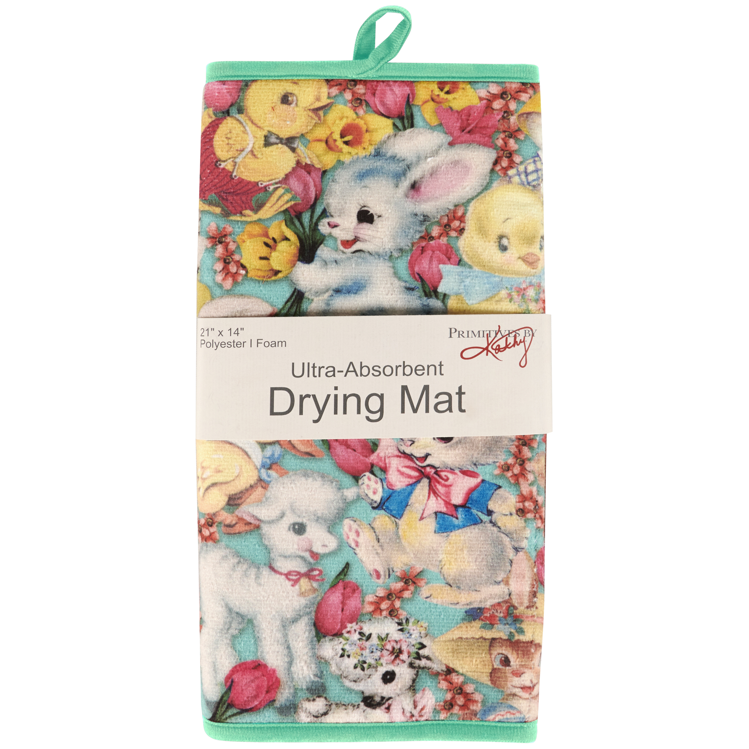 An ultra-absorbent drying mat from our Easter & Spring Collection displaying a collage of vintage easter bunny, duckling, and lamb designs. Seasonal drying mat features full color design on the 21 inch by 14 inch space to place items to dry with coordinating pastel green color on the back and trim. Our Vintage Easter drying mat includes a hanger at the top to display design or to air dry when not in use. Drying mat conveniently folds up for easy storage. Machine-washable for easy cleaning. A vintage Easter-themed kitchen accessory perfect for seasonal use.