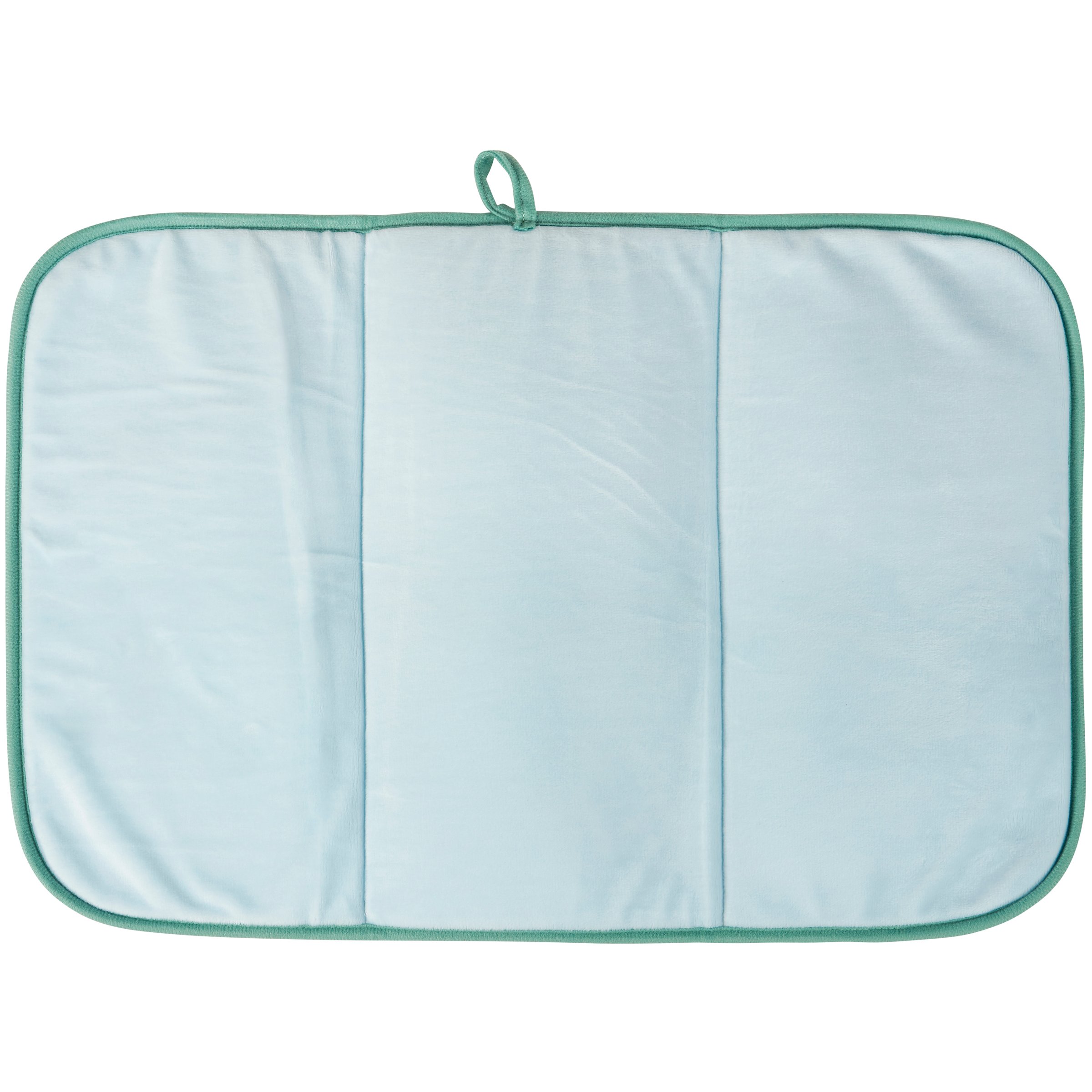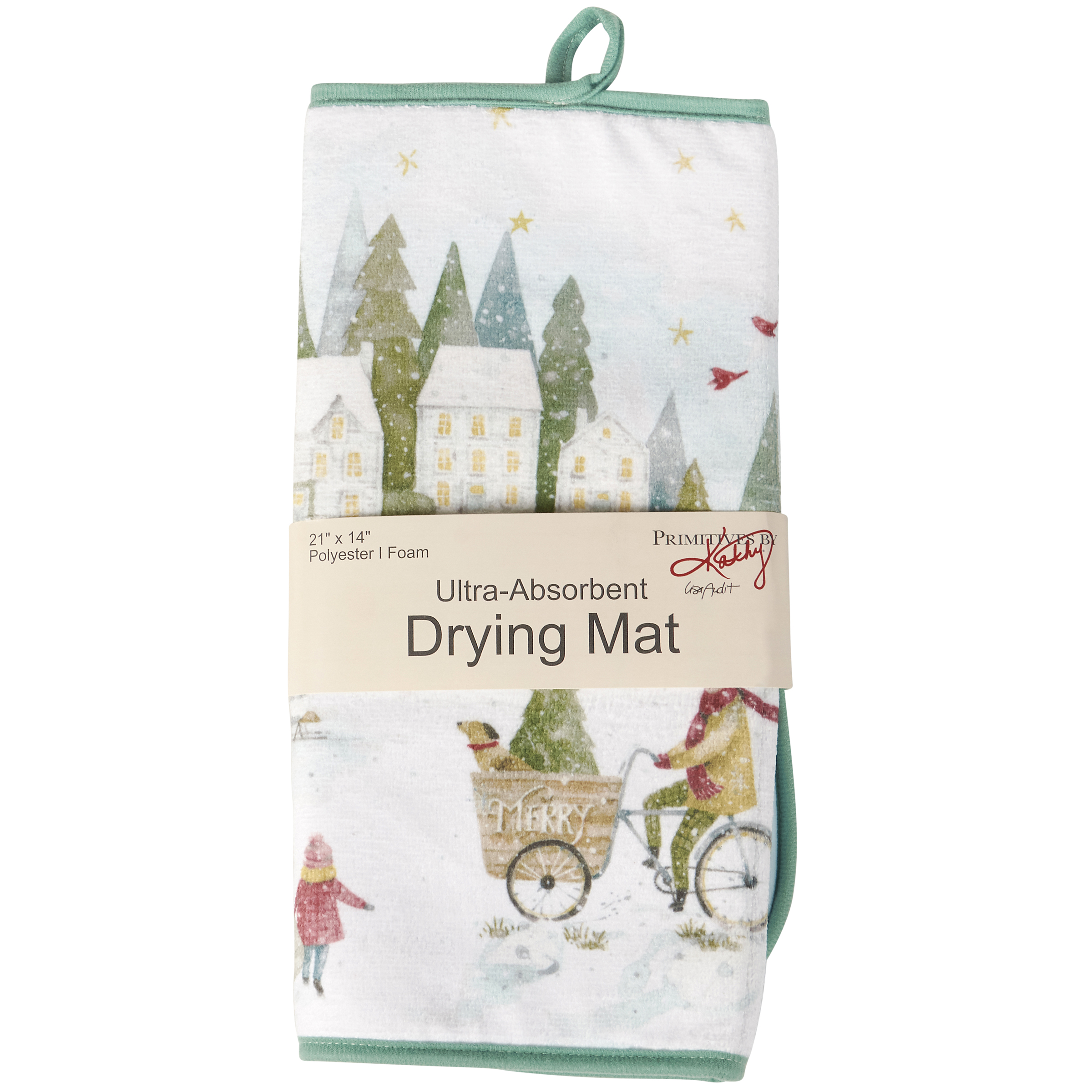 An ultra-absorbent drying mat from our Christmas Collection displaying a charming winter scene of people enjoying the snow. Design is replicated from original artwork hand painted in a delicate watercolor style. Seasonal drying mat features full color design on the 21 inch by 14 inch space to place items to dry with coordinating holiday green color on the back and trim. Our Winter Wonderland drying mat includes a hanger at the top to display design or to air dry when not in use. Drying mat conveniently folds up for easy storage. Machine-washable. A charming winter-themed kitchen accessory perfect for seasonal use.