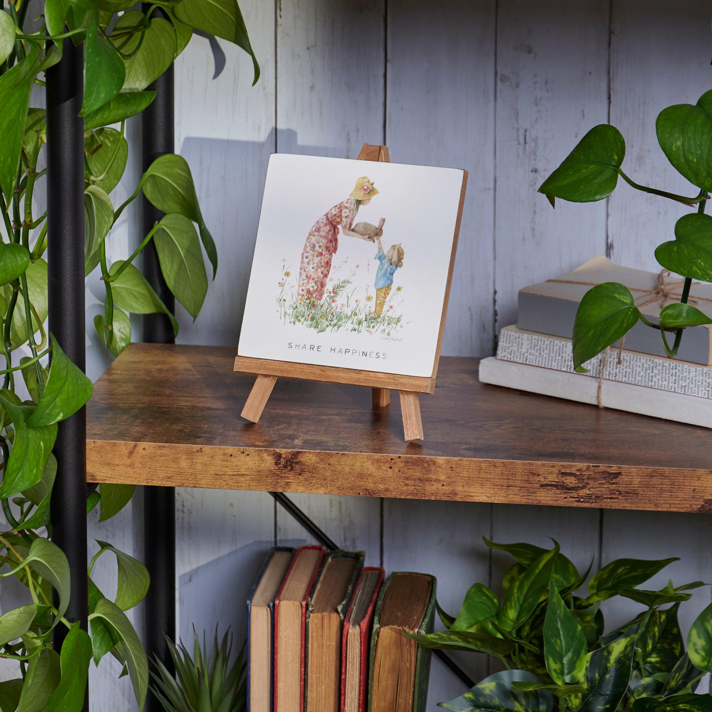 An easel décor piece from our Watercolor Collection featuring a mini easel holding an attached wooden art panel replicating a canvas. Art panel displays a charming scene of woman and child playing with a bunny surrounded by spring flowers above an inspirational sentiment that reads "Share Happiness." Design is replicated from original art hand painted in a delicate watercolor style. Our Share Happiness easel is ready to display without assembly using the stand and attached ribbon. Packaged in a kraft paper box with acrylic lid to easily view displayed art. An inspirational everyday home accent great for gifting that can be easily displayed in any home or work space.