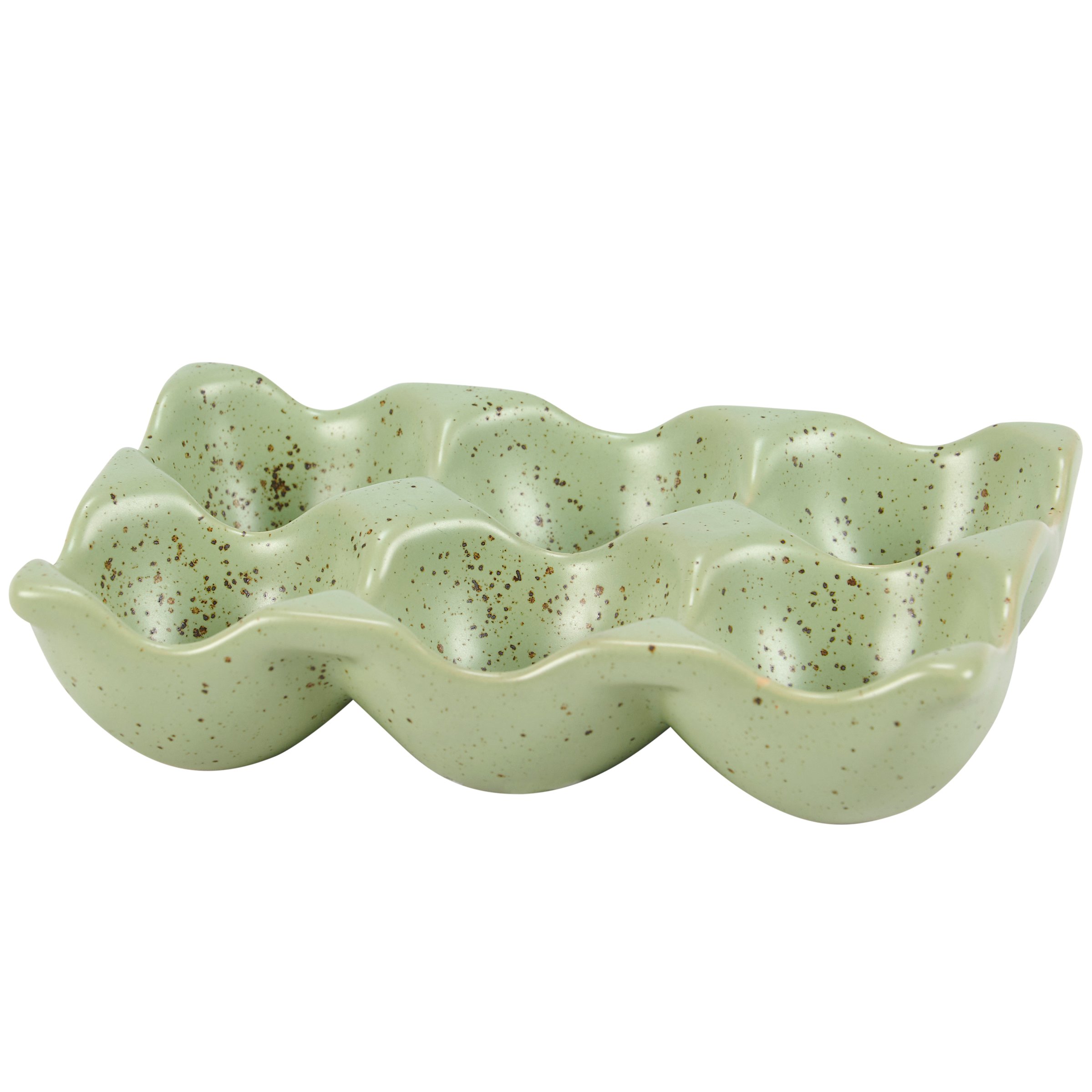A stoneware egg holder from our Farmhouse Collection displaying a muted green color and speckled accents that coordinates well with farmhouse décor. Egg holder features 6 spaces to hold eggs. Our Farmhouse egg holder is conveniently dishwasher safe for easy cleaning. A rustic kitchen accessory perfect for everyday use.