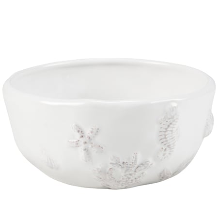 A lightweight, but durable ceramic bowl from our Beach Collection displaying a clean white glaze finish with embossed designs of various sea life and ocean plants around the bowl. Embossed ocean designs feature textured detail. Our Beach bowl is microwave, dishwasher, and food safe for convenient use. A piece of everyday tableware perfect for oceanic themed gatherings.