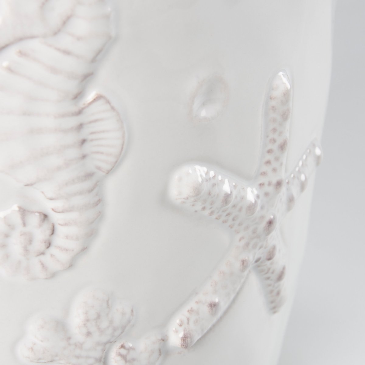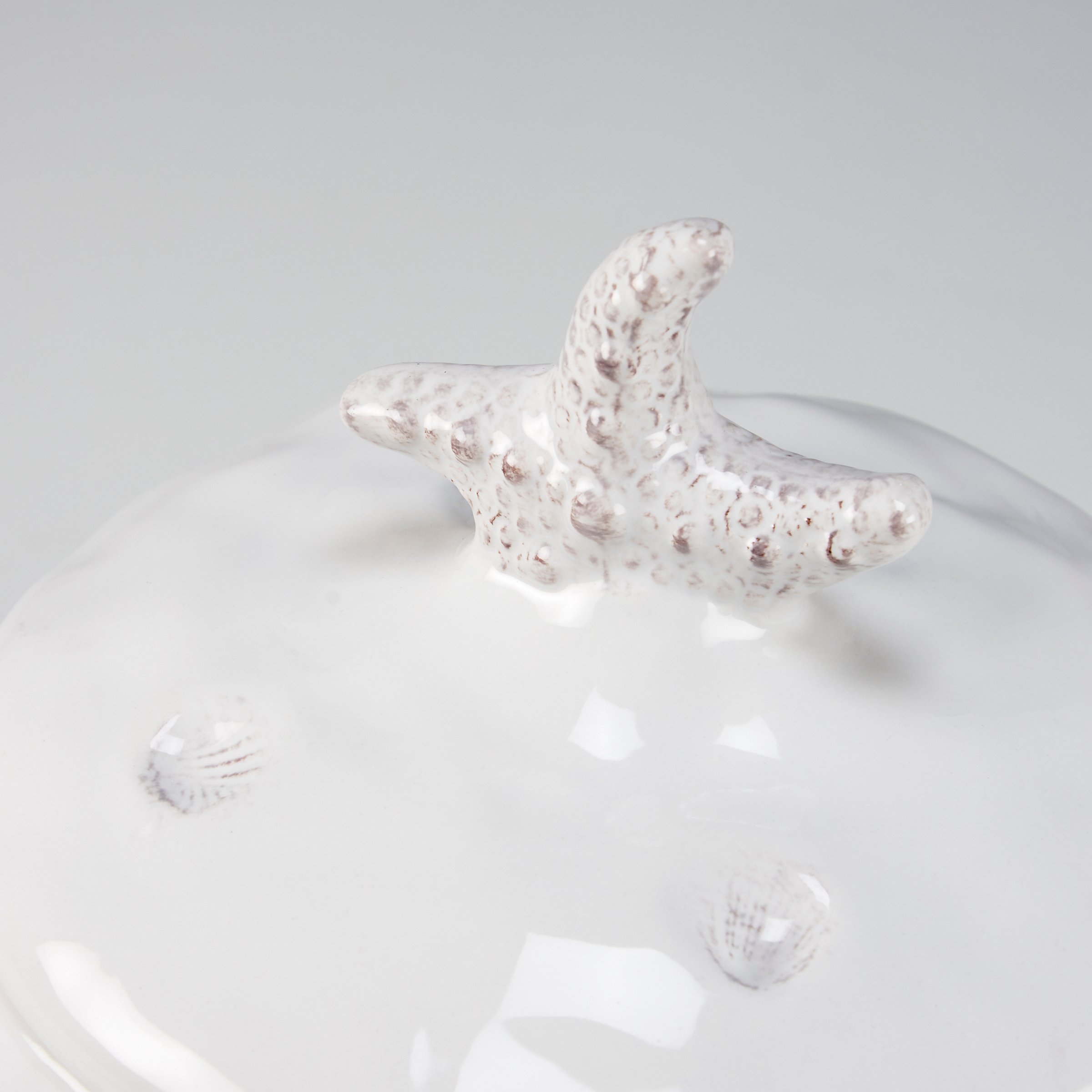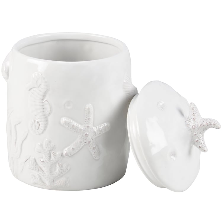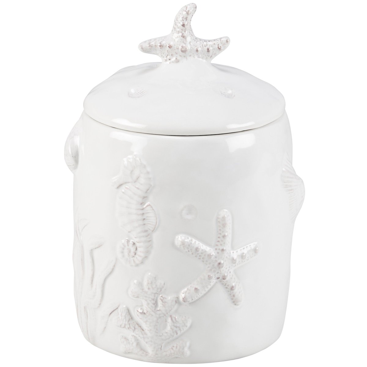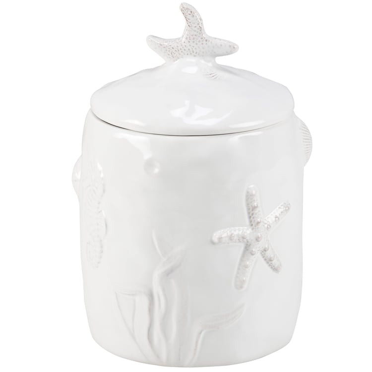 A lightweight, but durable ceramic canister from ourĀ Beach Collection displaying a clean white glaze finish with embossed designs of various sea life and ocean plants around the outside and sculpted starfish for lid handle. Embossed ocean designs feature textured detail. Our Beach cansiter is microwave, dishwasher, and food safe for convenient use. A piece of everyday tableware perfect for oceanic themed gatherings.