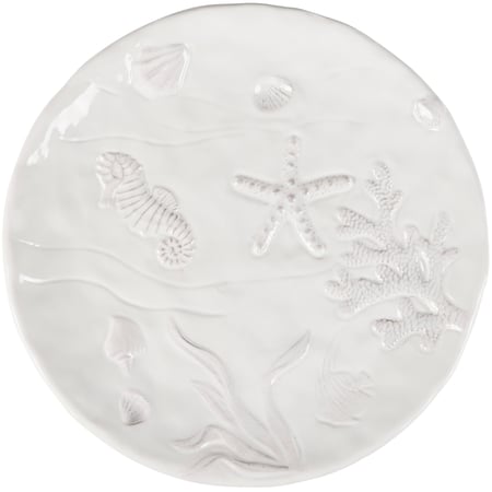 A lightweight, but durable ceramic dinner plate from our Beach Collection displaying a clean white glaze finish with embossed designs of various sea life and ocean plants on the plate. Embossed ocean designs feature textured detail. Our Beach dinner plate is microwave, dishwasher, and food safe for convenient use. A piece of everyday tableware perfect for oceanic themed gatherings.