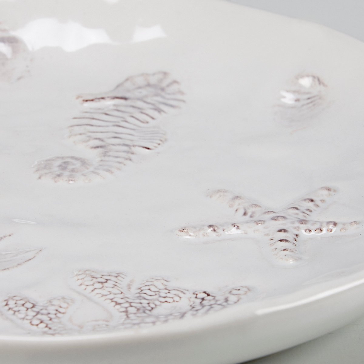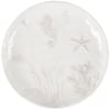 A lightweight, but durable ceramic salad plate from ourĀ Beach Collection displaying a clean white glaze finish with embossed designs of various sea life and ocean plants on the plate. Embossed ocean designs feature textured detail. Our Beach salad plate is microwave, dishwasher, and food safe for convenient use. A piece of everyday tableware perfect for oceanic themed gatherings.