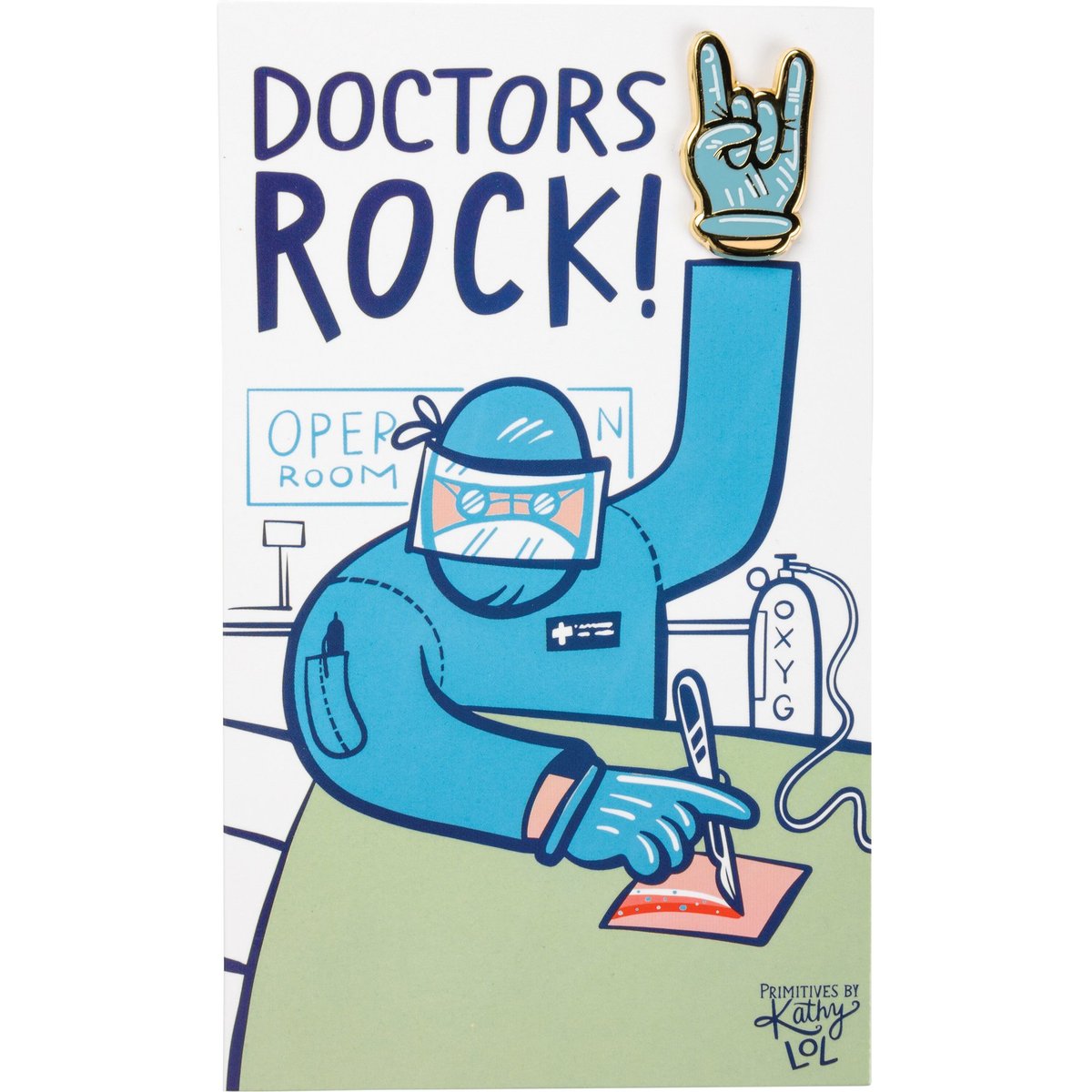A high-quality hard enamel gloved "rock on" hand symbol pin with butterfly clip closure. Comes packaged on a double-sided, thoughtfully-coordinated "Doctors Rock" with doctor in surgery card and a blank space on the reverse side for a handwritten note.