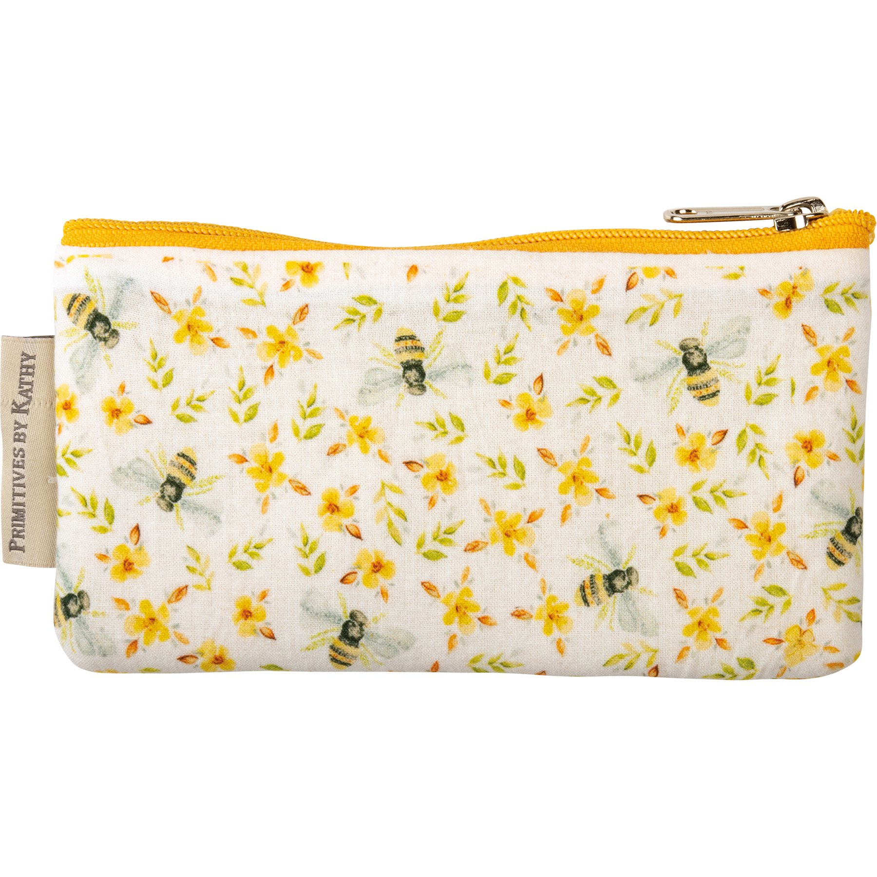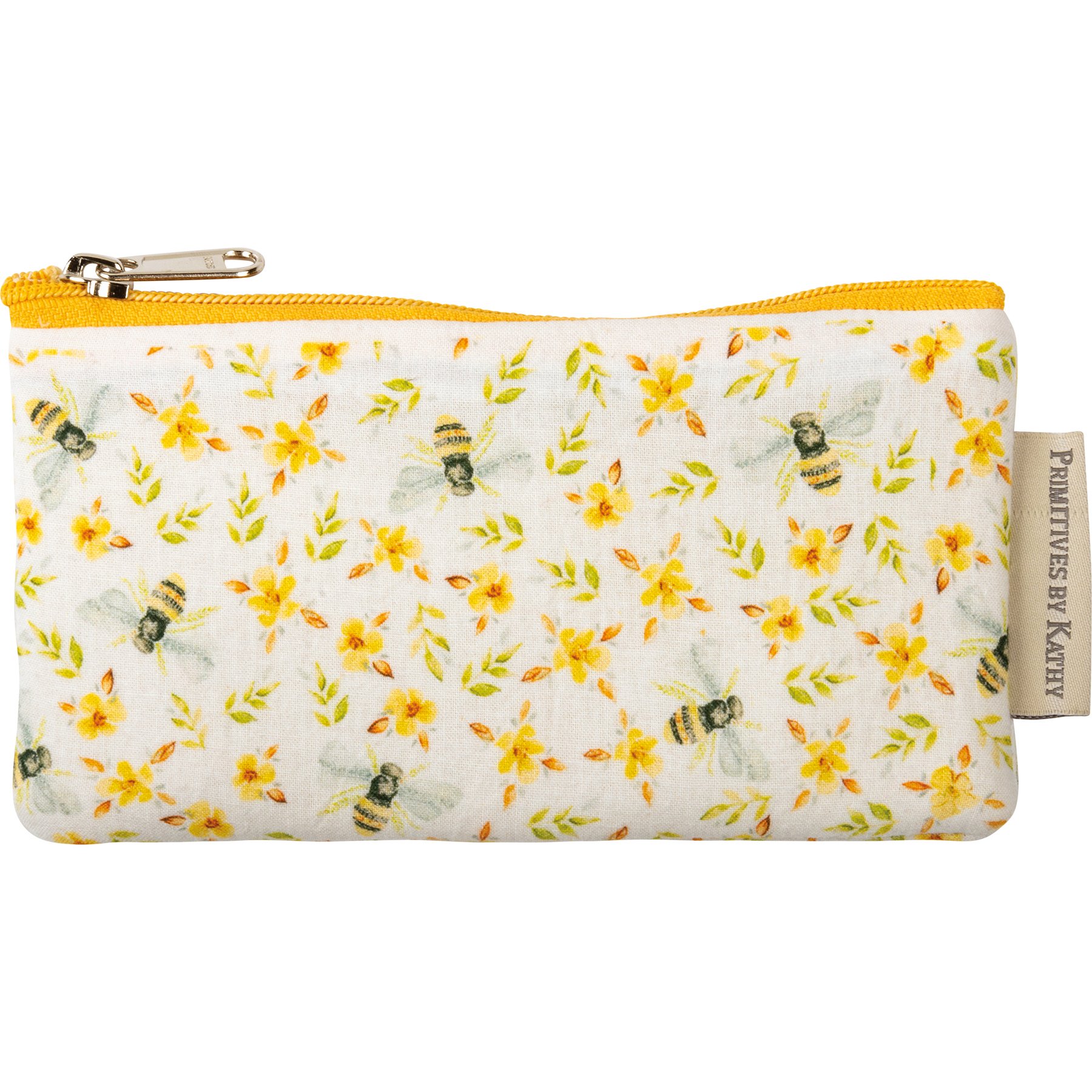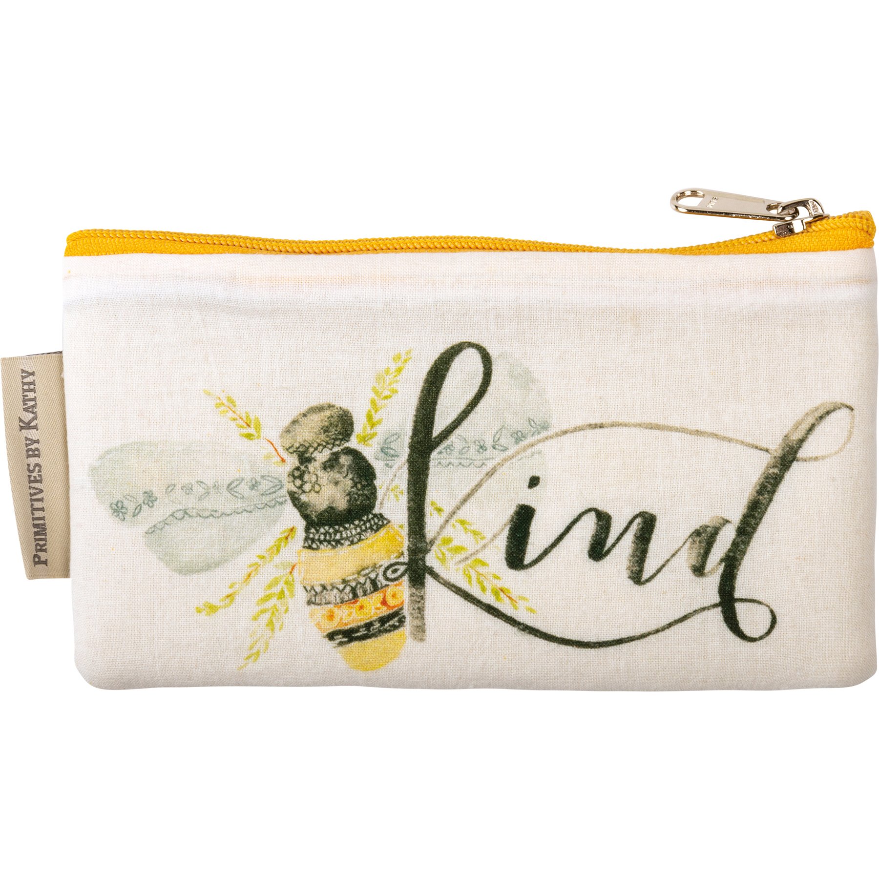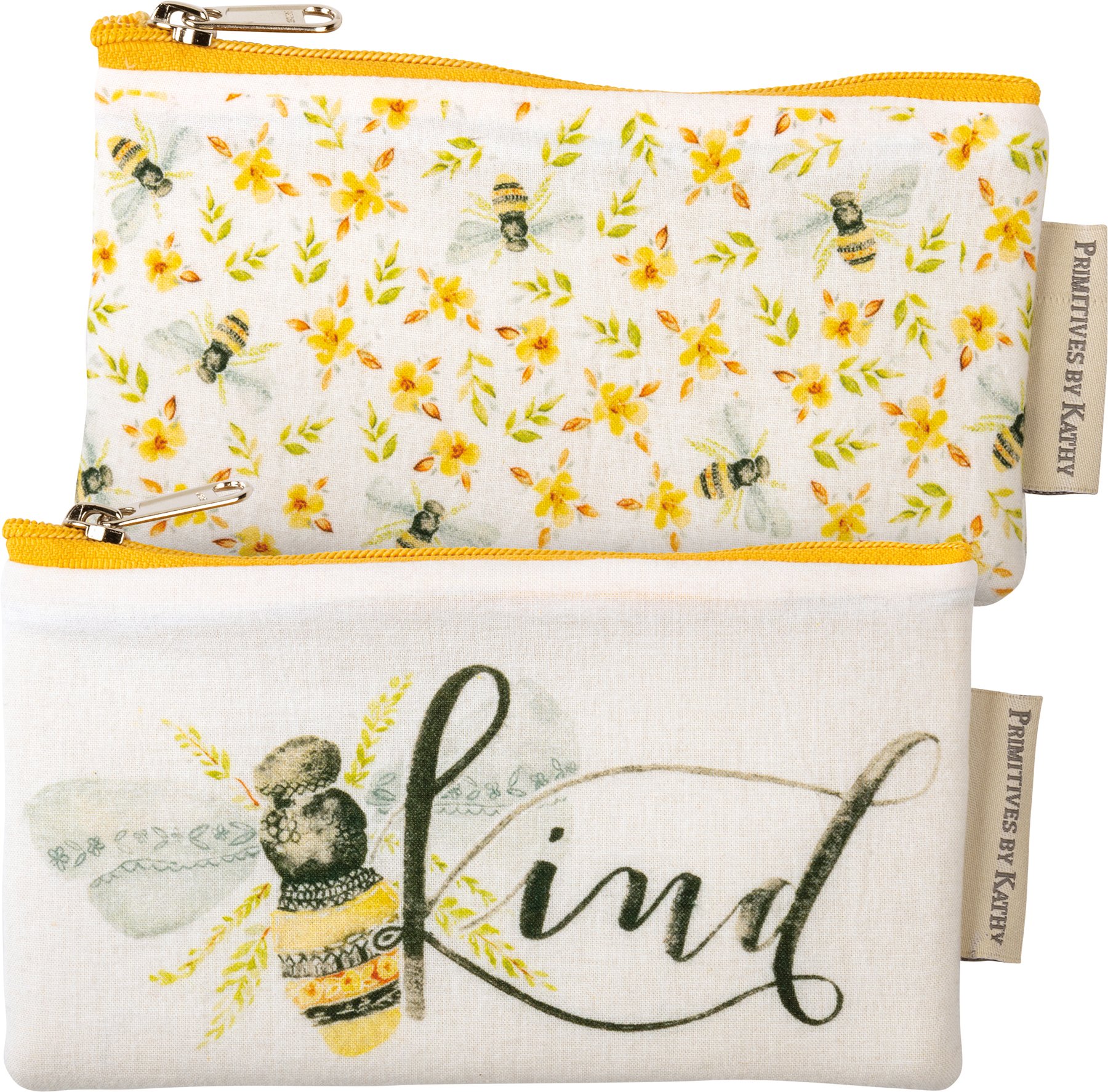From our Garden Collection a set of two everything zipper pouches with food-safe water-resistant lining, perfect for holding daily essentials, snacks, and more. One pouch features "Kind" sentiment. Pouches feature coordinating watercolor bee designs. Pouches measure 7" x 3.50". Double-sided. Machine-washable. Our bee pouch set includes hangtag displaying suggested uses.