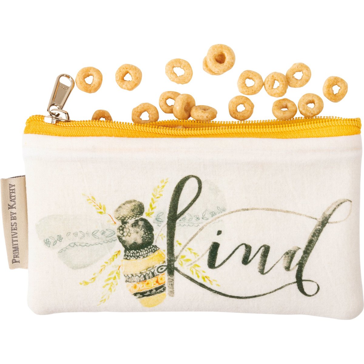 From our Garden Collection a set of two everything zipper pouches with food-safe water-resistant lining, perfect for holding daily essentials, snacks, and more. One pouch features "Kind" sentiment. Pouches feature coordinating watercolor bee designs. Pouches measure 7" x 3.50". Double-sided. Machine-washable. Our bee pouch set includes hangtag displaying suggested uses.