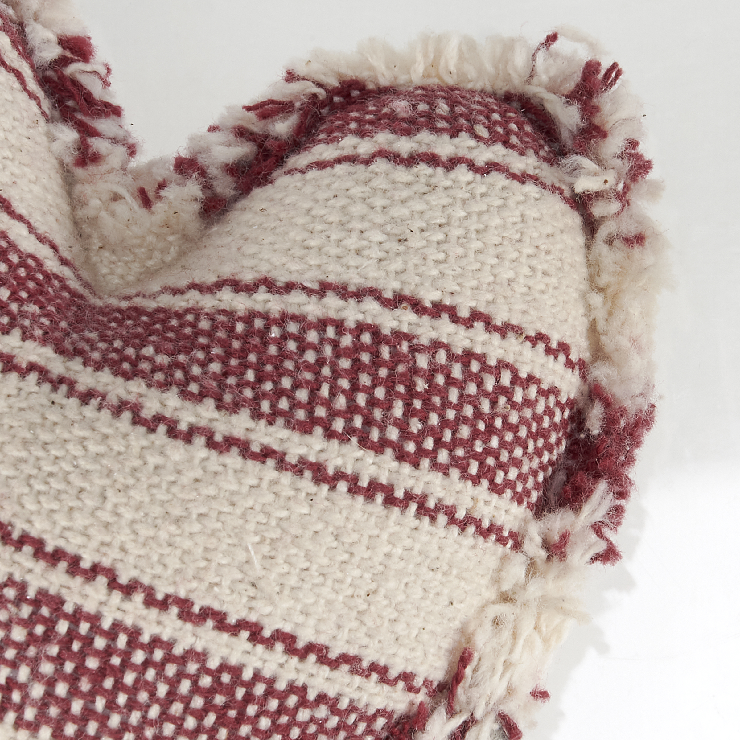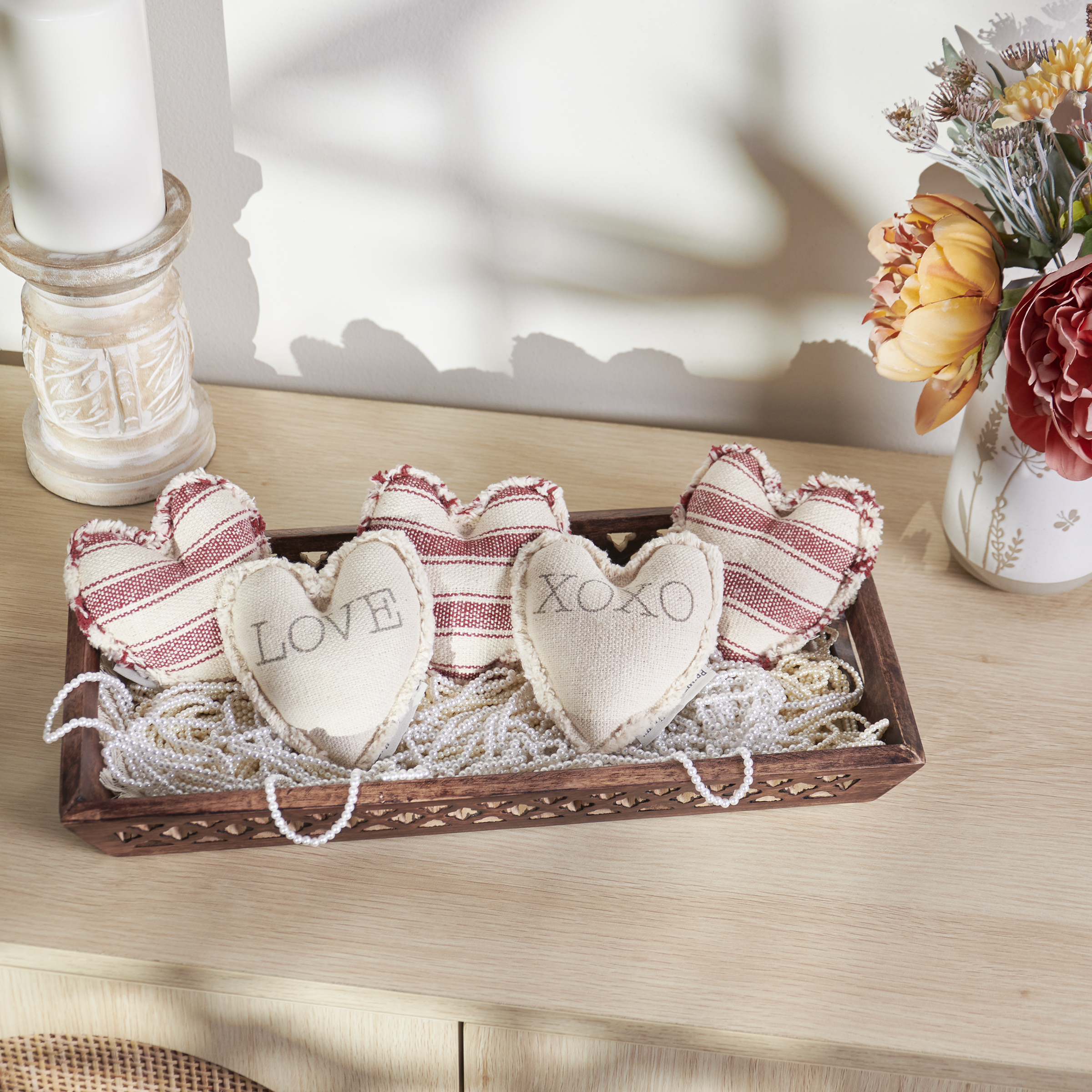 A set of five cotton fabric hearts from our Valentine's Day Collection displaying a rustic inspired handmade style and love-themed sentiments. Decorative heart set includes three hearts with deep red stripe designs and two with sentiments that read "Love" and "XOXO." Our Love fabric heart set is perfect for rustic Valentine's Day decorating and are easy to add to any seasonal display.
