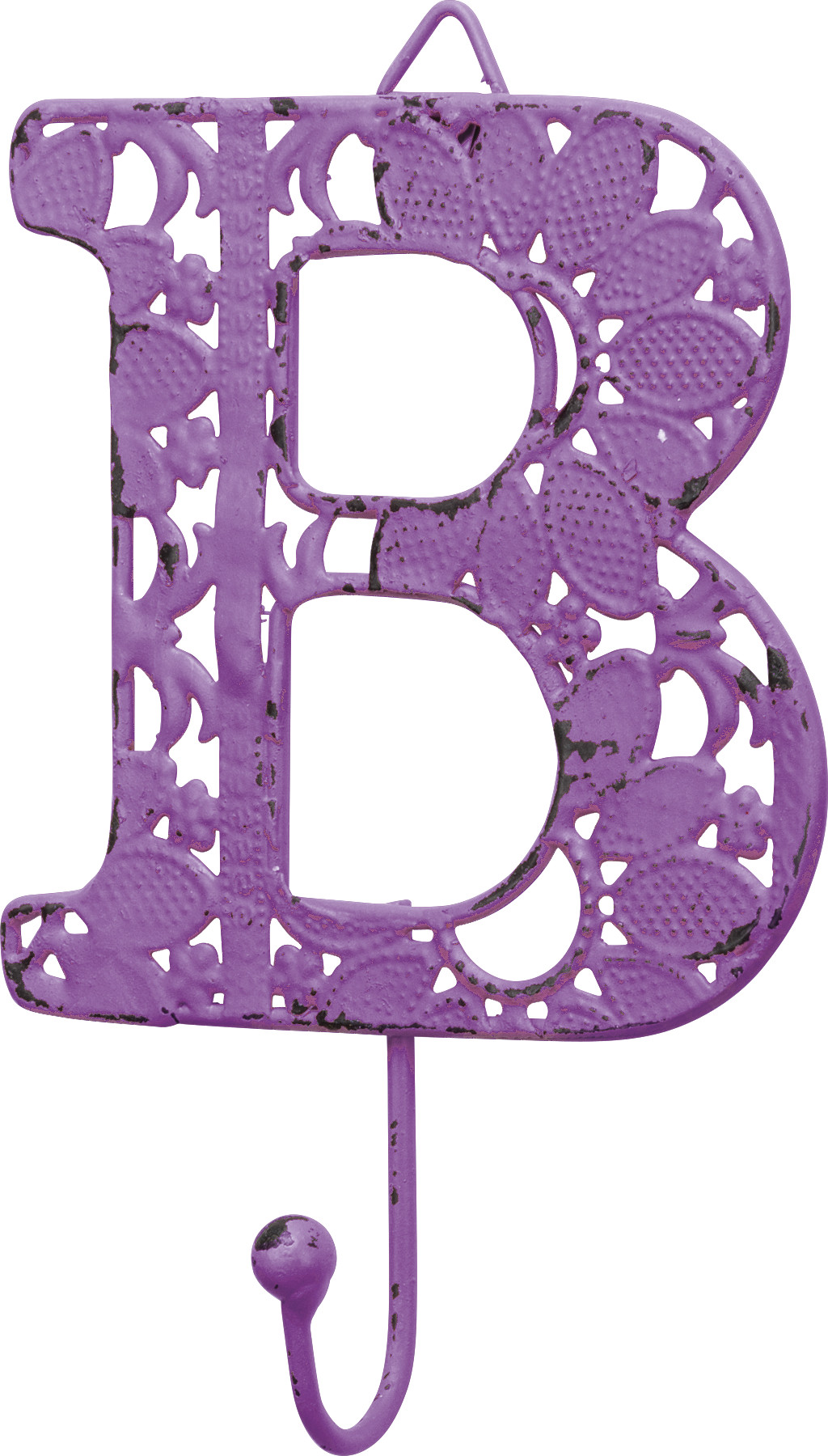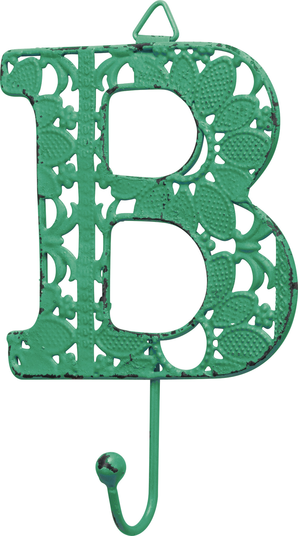A set of metal wall hooks displaying a letter "B" design with a fancy pattern cutout inside and a hook attached to the bottom for hanging accessories or decor. Fancy metal letter set features 5 letter "B" wall hooks in one of each color including yellow, green, cream, purple, and orange. Letter wall hooks also feature distressed details for an aged appearance. Each fancy metal letter wall hook is easy to hang via the attached hanger on top. A set of rustic home accents perfect for adding personality to everyday home decor.
