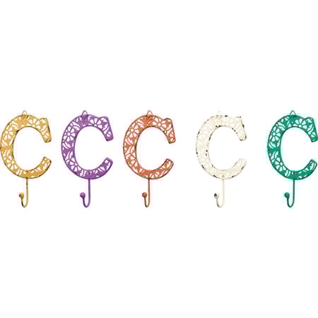 A set of metal wall hooks displaying a letter "C" design with a fancy pattern cutout inside and a hook attached to the bottom for hanging accessories or decor. Fancy metal letter set features 5 letter "C" wall hooks in one of each color including yellow, green, cream, purple, and orange. Letter wall hooks also feature distressed details for an aged appearance. Each fancy metal letter wall hook is easy to hang via the attached hanger on top. A set of rustic home accents perfect for adding personality to everyday home decor.