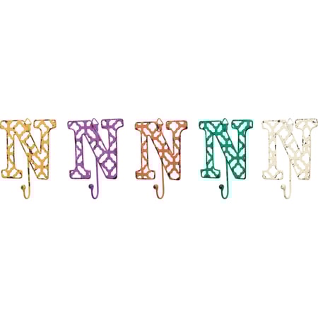 A set of metal wall hooks displaying a letter "N" design with a fancy pattern cutout inside and a hook attached to the bottom for hanging accessories or decor. Fancy metal letter set features 5 letter "N" wall hooks in one of each color including yellow, green, cream, purple, and orange. Letter wall hooks also feature distressed details for an aged appearance. Each fancy metal letter wall hook is easy to hang via the attached hanger on top. A set of rustic home accents perfect for adding personality to everyday home decor.