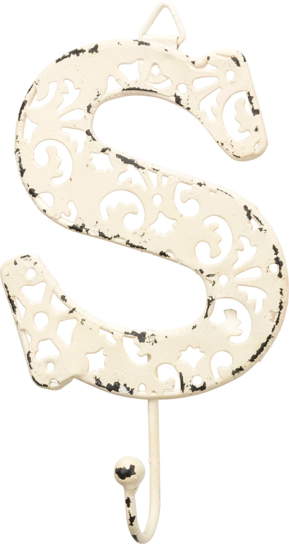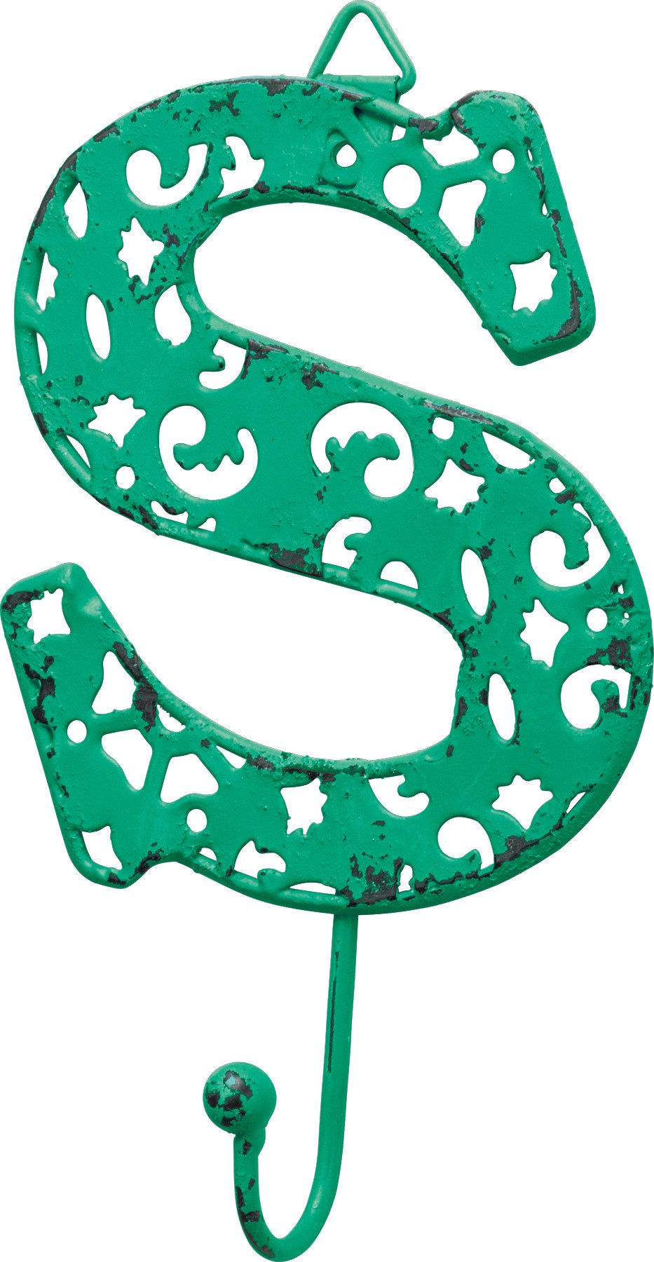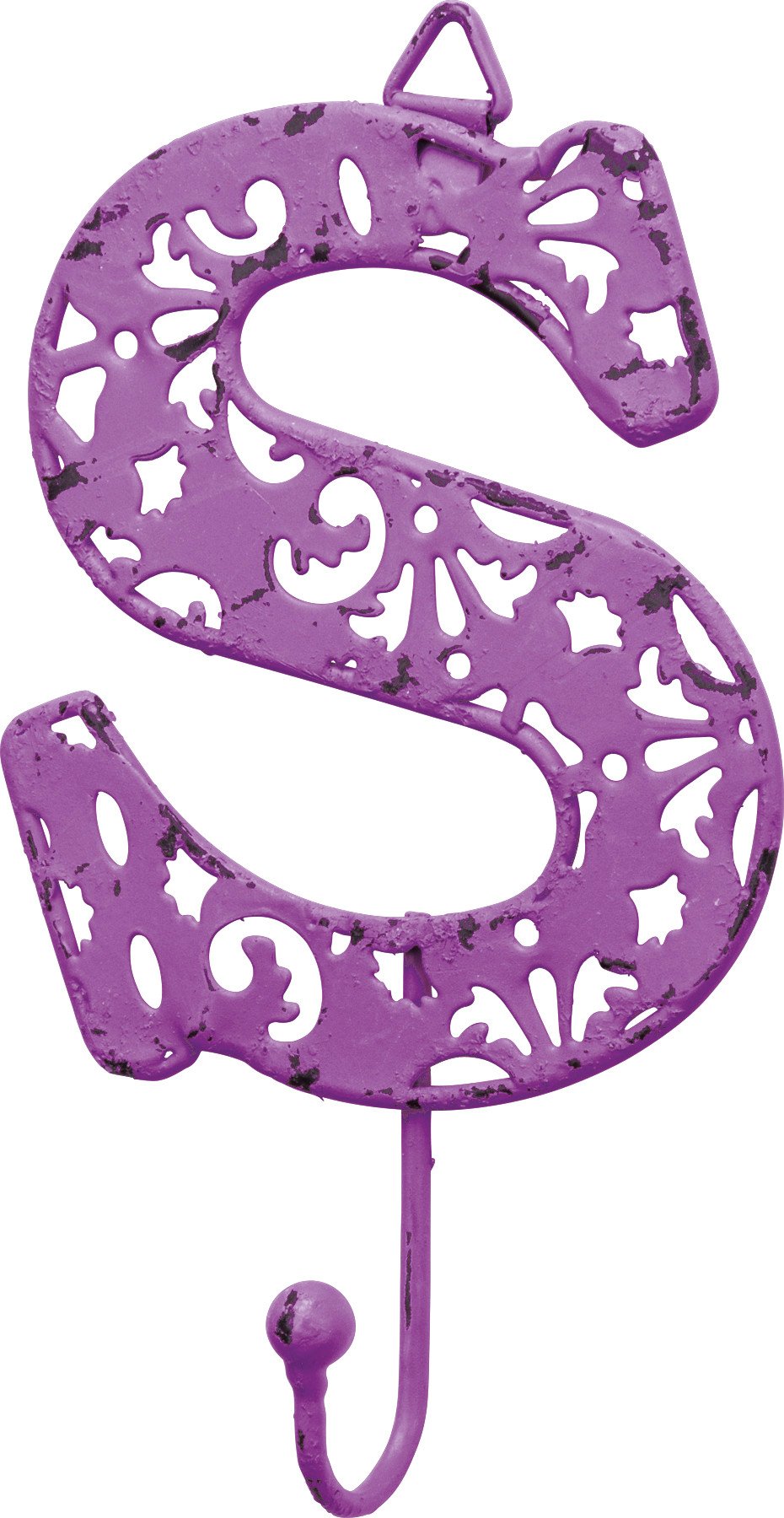 A set of metal wall hooks displaying a letter "S" design with a fancy pattern cutout inside and a hook attached to the bottom for hanging accessories or decor. Fancy metal letter set features 5 letter "S" wall hooks in one of each color including yellow, green, cream, purple, and orange. Letter wall hooks also feature distressed details for an aged appearance. Each fancy metal letter wall hook is easy to hang via the attached hanger on top. A set of rustic home accents perfect for adding personality to everyday home decor.