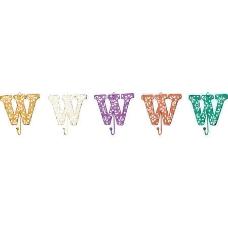 A set of metal wall hooks displaying a letter "W" design with a fancy pattern cutout inside and a hook attached to the bottom for hanging accessories or decor. Fancy metal letter set features 5 letter "W" wall hooks in one of each color including yellow, green, cream, purple, and orange. Letter wall hooks also feature distressed details for an aged appearance. Each fancy metal letter wall hook is easy to hang via the attached hanger on top. A set of rustic home accents perfect for adding personality to everyday home decor.
