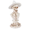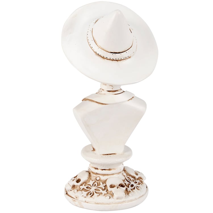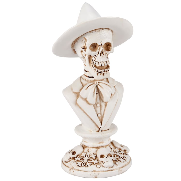 A decorative figurine from our Halloween Collection displaying a bust of a gentleman skeleton in formal wear on top of a decorative base. Skeleton figurine features sculpted details with metallic bronze accents for added dimension. Our Gentleman Skeleton figurine is ideal for a moody seasonal home accent and complements well with other pieces in the collection to create a cohesive display.