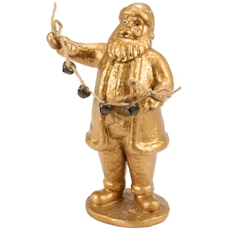 A decorative figurine from our Christmas Collection displaying a vintage Santa design with sculpted details and metallic antique finish. Santa figurine features unique details including metal jingle bells on a jute string attached to his hands. Our Jingle Santa figurine is designed to free stand on flat surface for easy display. A vintage Christmas home accent with a variety of seasonal display options.