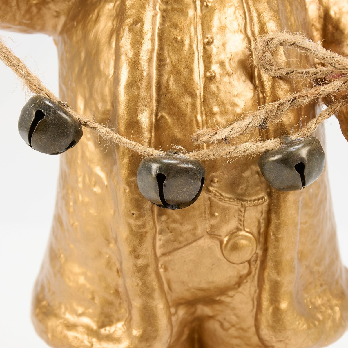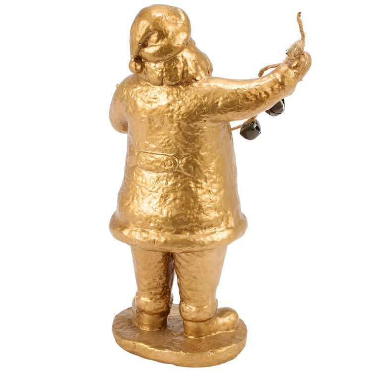 A decorative figurine from our Christmas Collection displaying a vintage Santa design with sculpted details and metallic antique finish. Santa figurine features unique details including metal jingle bells on a jute string attached to his hands. Our Jingle Santa figurine is designed to free stand on flat surface for easy display. A vintage Christmas home accent with a variety of seasonal display options.