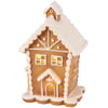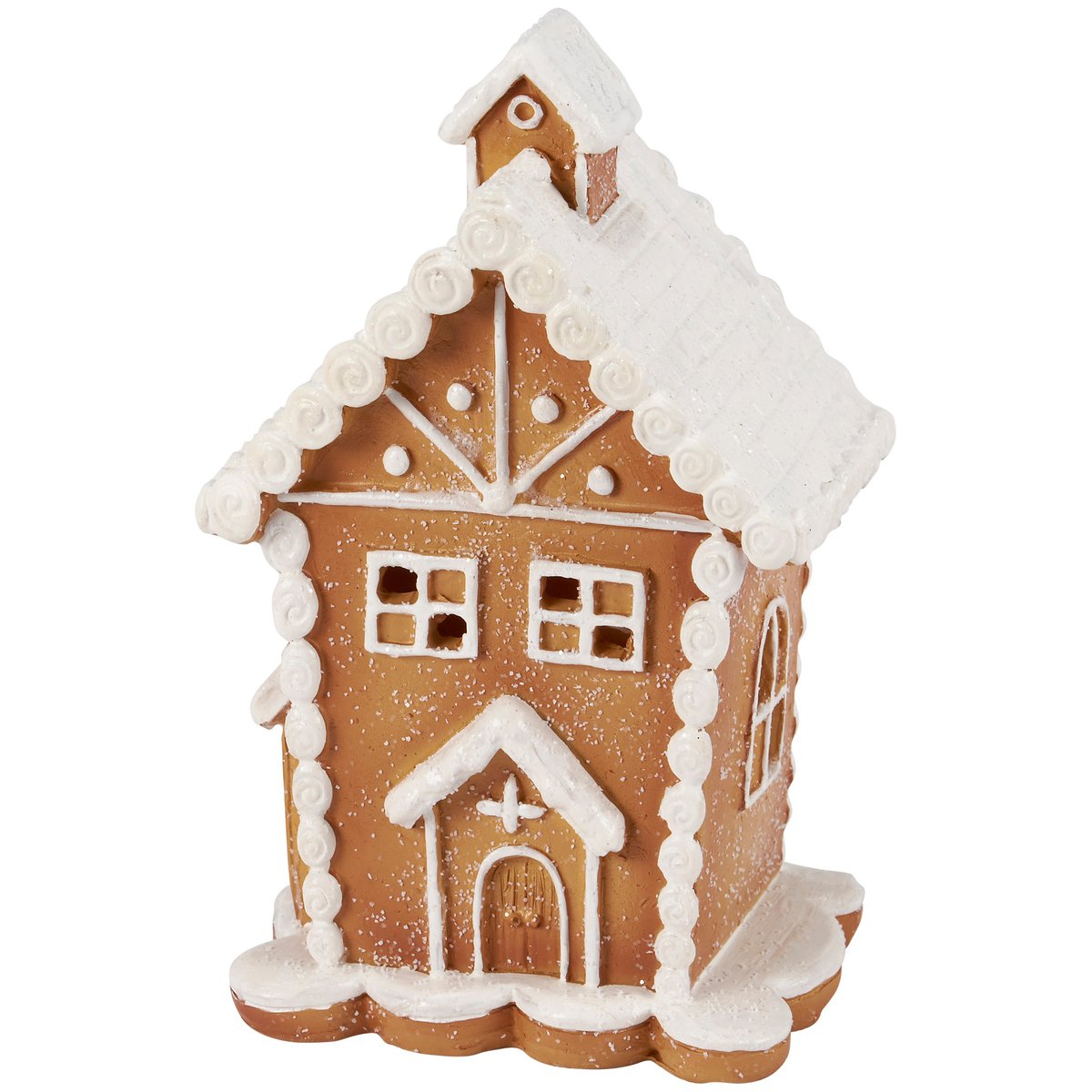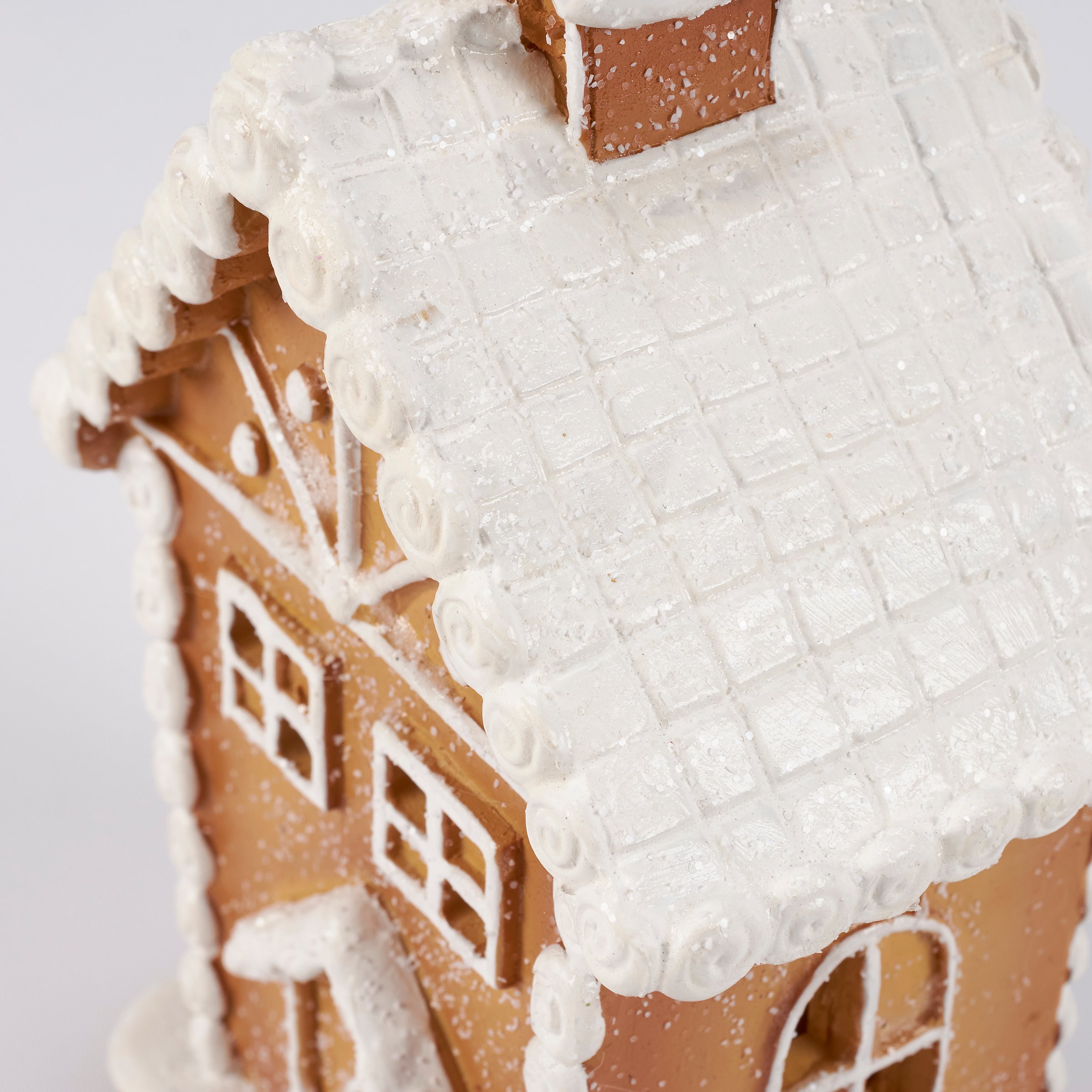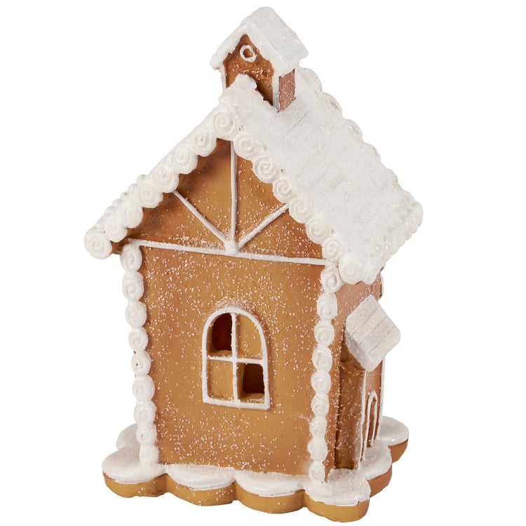 A decorative figurine from our Christmas Collection displaying a gingerbread inspired snowy church design with sculpted details. Gingerbread church features a mica coating for a snowy appearance and a light source inside that illuminates the window cutouts powered by 2 included LR44 batteries. Our Lighted Iced Gingerbread figurine is designed to free-stand on any flat surface. A fun gingerbread-themed home accent perfect for adding mood lighting to any seasonal display.