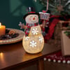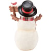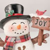 A decorative figurine from our Christmas Collection displaying a detailed snowman design that is holding a sign with a festive sentiment that reads "Joy" and a cardinal on top. Snowman figurine features touches of glitter for a frosty appearance as well as a light source inside that illuminates the snowflake cutouts. Lighting is powered by 3 AAA batteries (not included). Our Lighted Snowman Joy figurine is ideal for a fun seasonal home accent and complements well with other pieces in the collection to create a cohesive display.