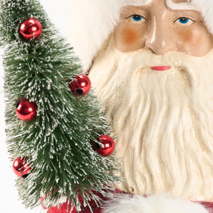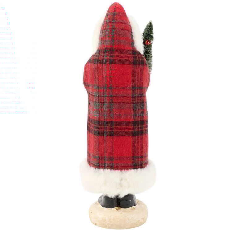 A decorative figurine from our Christmas Collection displaying a vintage Santa design with snowy bristle tree in his hands. Santa figurine features unique details including fabric plaid coat with white fur trim and metallic red blub ornaments in the tree. Our Plaid Santa figurine is designed to free stand on flat surface for easy display. A rustic Christmas home accent with a variety of seasonal display options.