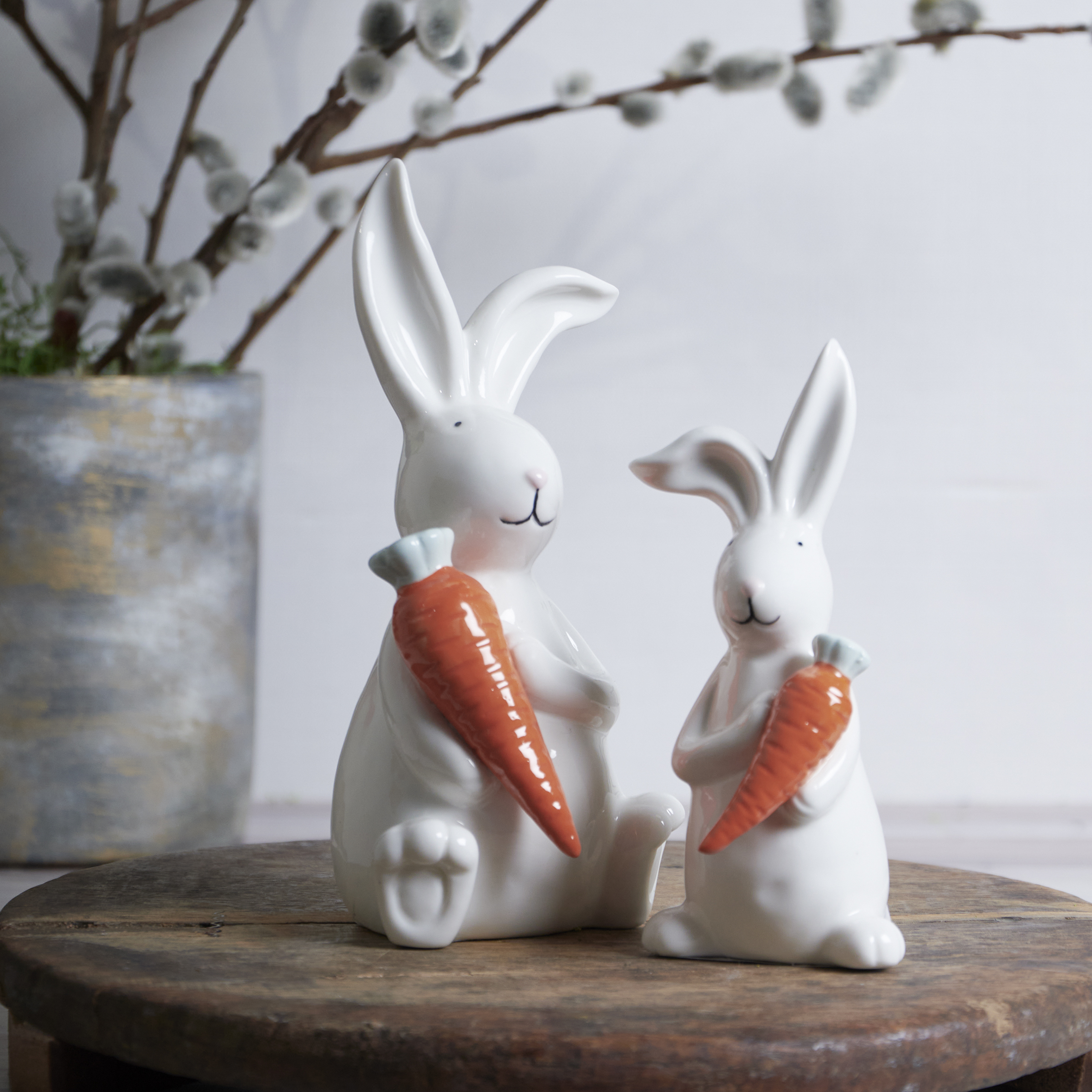 A set of stoneware figurines from our Easter & Spring Collection including two bunnies holding colored carrots. Bunny figurines feature clean white design that easily blends with a variety of colors and styles. Our Bunnies figurine set is ideal for a home accent and complements well with other pieces in the collection to create a cohesive display.