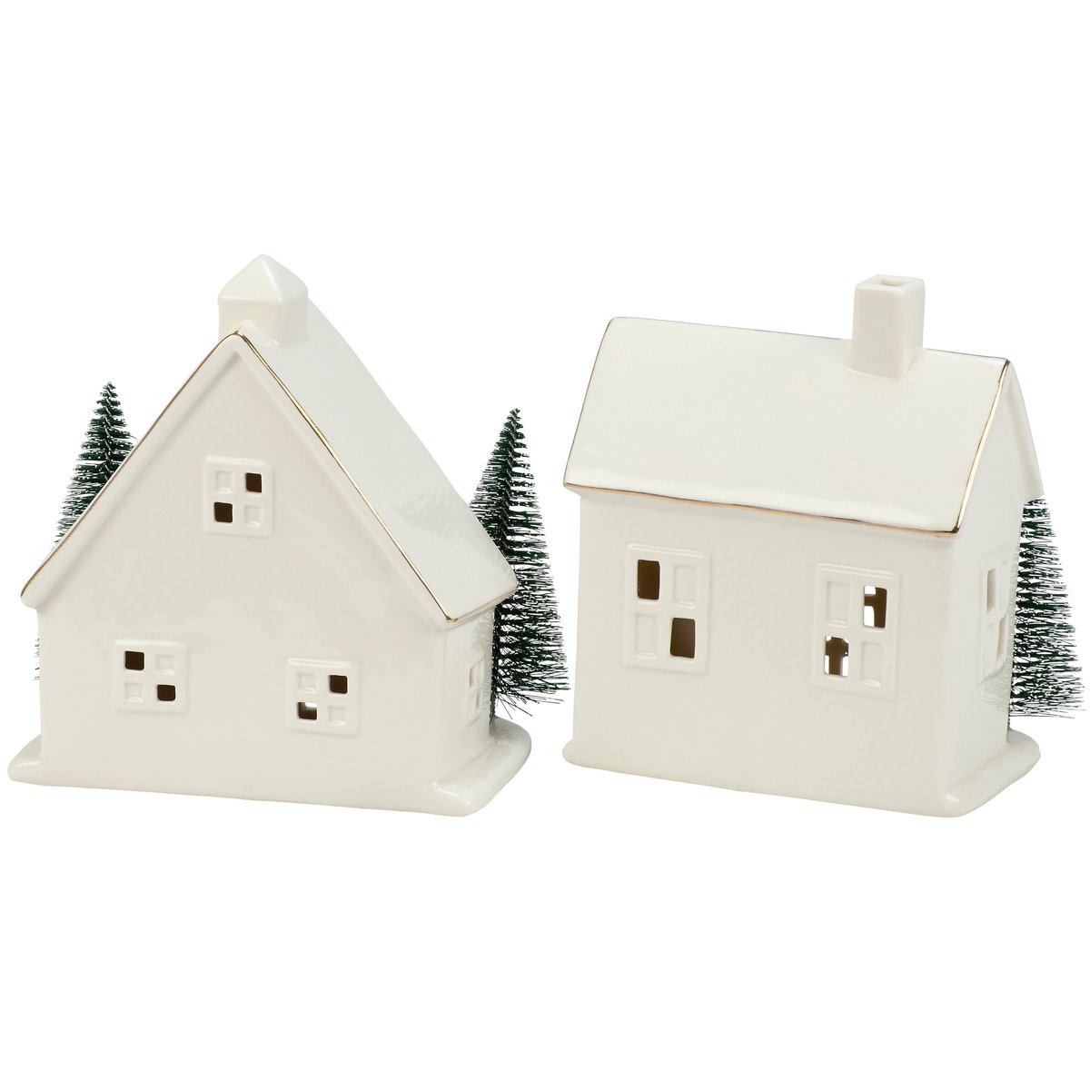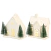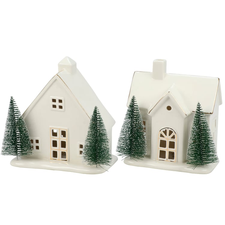 A set of 2 stoneware figurines from our Christmas Collection displaying individual winter house designs with cream glaze finish and metallic accents as well as snowy bristle trees. Each winter house figurine features a light source inside that illuminates the windows powered by 3 included LR44 batteries. Our Lighted Houses figurine set is designed to free-stand on flat surface for display. A set of winter-themed home accents perfect for adding seasonal mood lighting to any space.