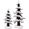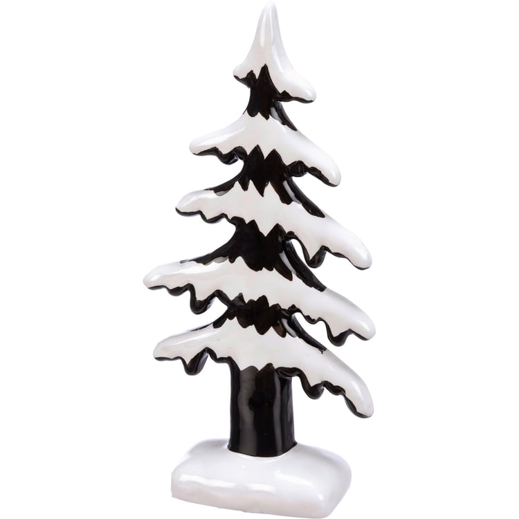 A set of two wintry black and white ceramic tree figurines with sturdy bases from our Christmas Collection. Includes one small and one large tree with snowy details making them perfect for the winter holidays. Our Snowy Tree Figurine Set free-stands alone.