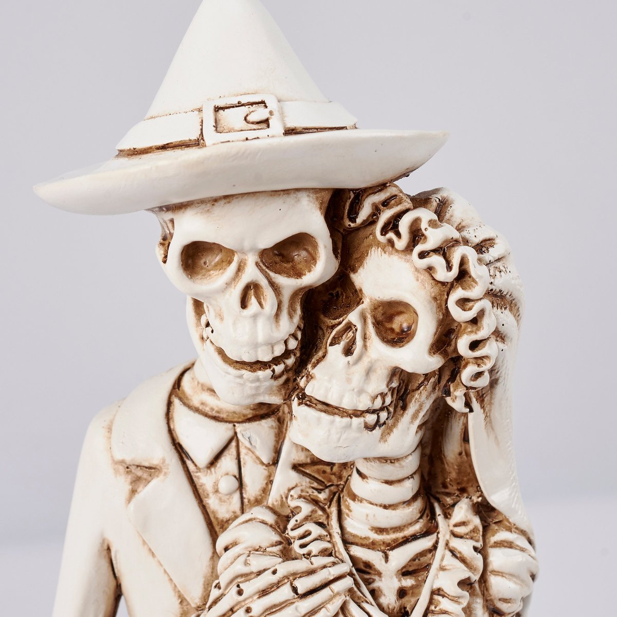 A decorative figurine from our Halloween Collection displaying a skeleton couple in formal wear embracing each other. Skeleton figurine features sculpted details with metallic bronze accents for added dimension. Our Skeleton Couple figurine is ideal for a moody seasonal home accent and complements well with other pieces in the collection to create a cohesive display.