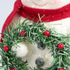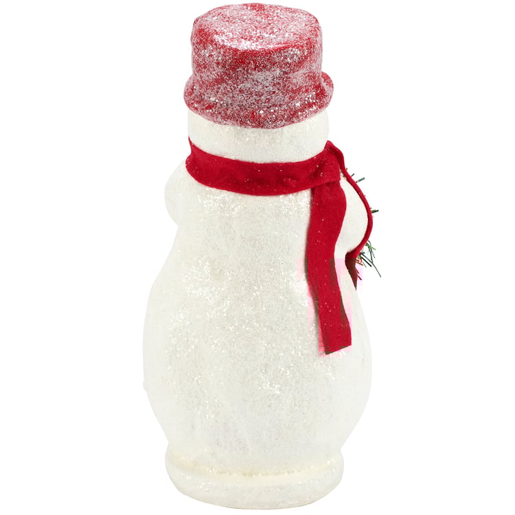 A decorative figurine from our Christmas Collection displaying a retro snow woman design with painted details throughout and a mica coating for a snowy appearance. Snow woman figurine features cute details including a faux holiday wreath in her hands and a holly accent on her hat. Our Snow Woman figurine is designed to free stand on flat surface for easy display. A retro Christmas home accent with a variety of seasonal display options.
