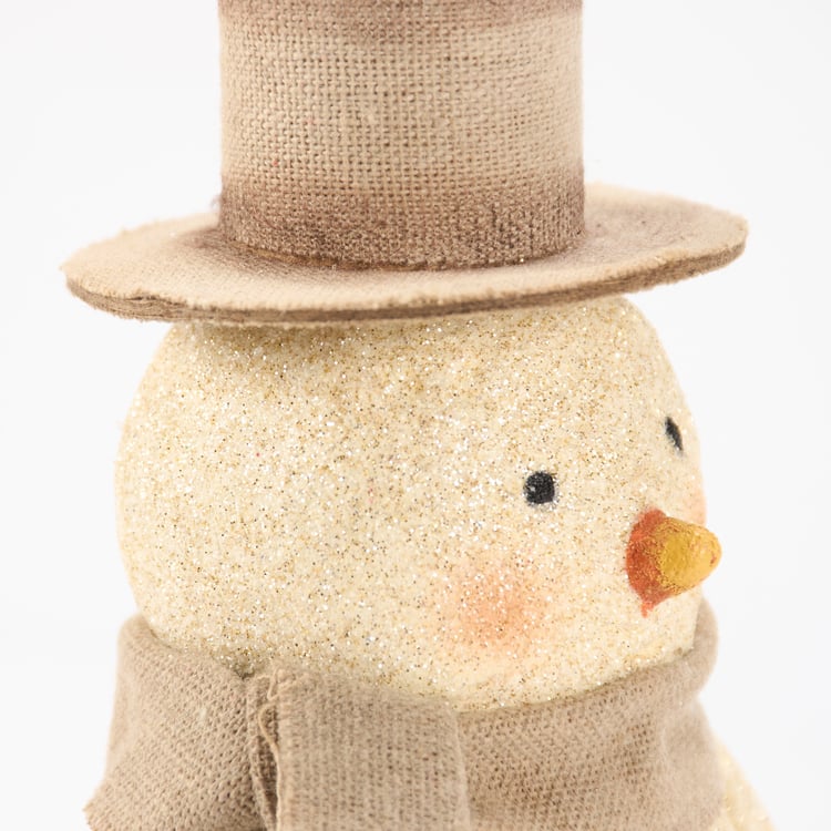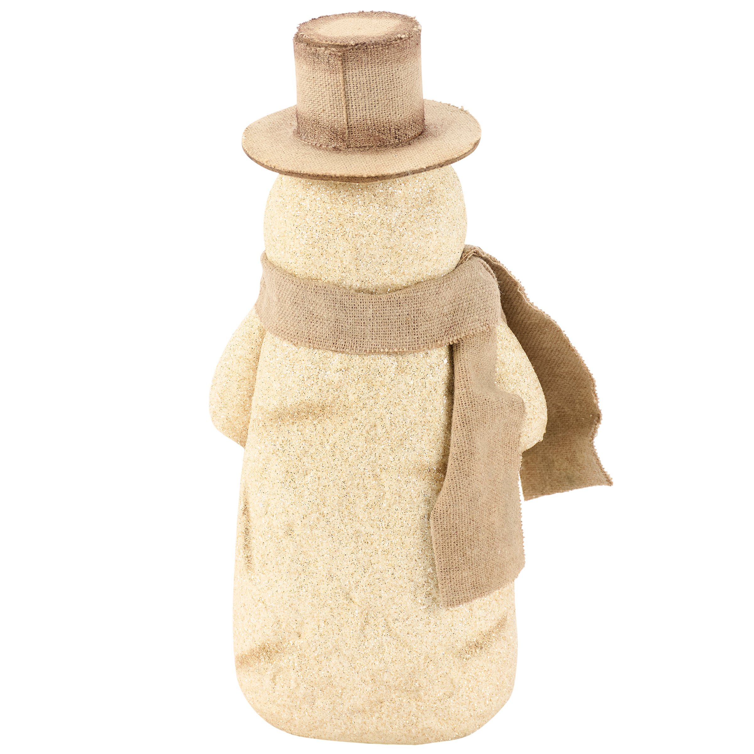A decorative figurine from our Christmas Collection displaying a vintage snowman design with painted details and a glitter coating for a stylish snowy appearance. Snowman figurine features cute details including fabric scarf and top hat. Our Vintage Snowman figurine is designed to free stand on flat surface for easy display. A vintage Christmas home accent with a variety of seasonal display options.