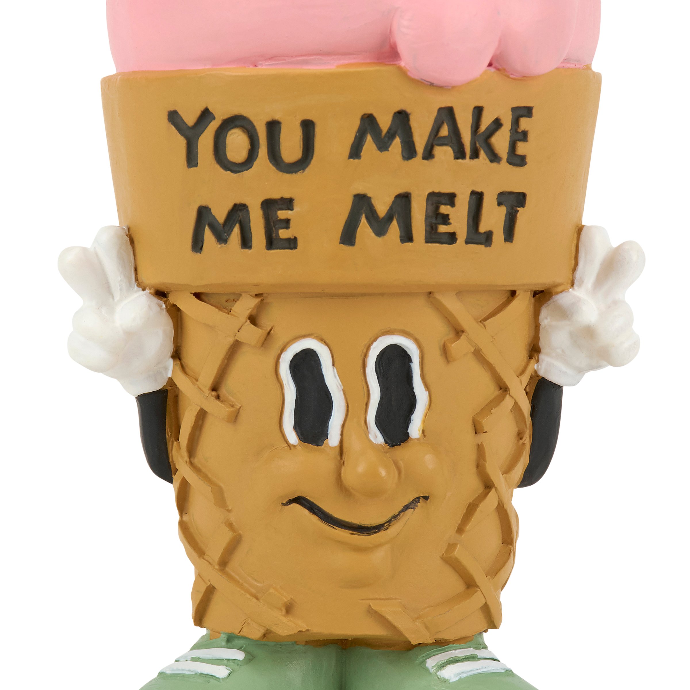 A decorative figurine from our LOL-Made You Smile Collection featuring a fun food inspired design recreated from original hand illustrated LOL characters. This LOL figurine displays a cute ice cream cone character with melting pink ice cream detail and a fun love-themed sentiment etched into it that reads "You Make Me Melt." Our You Make Me Melt figurine is designed to free stand on flat surface for display to easily add personality to any home or work space. For decorative use only; this is not a toy. A food-themed gift perfect for both friends and partners on Valentine's Day or as fun love-themed decor in everyday moments.