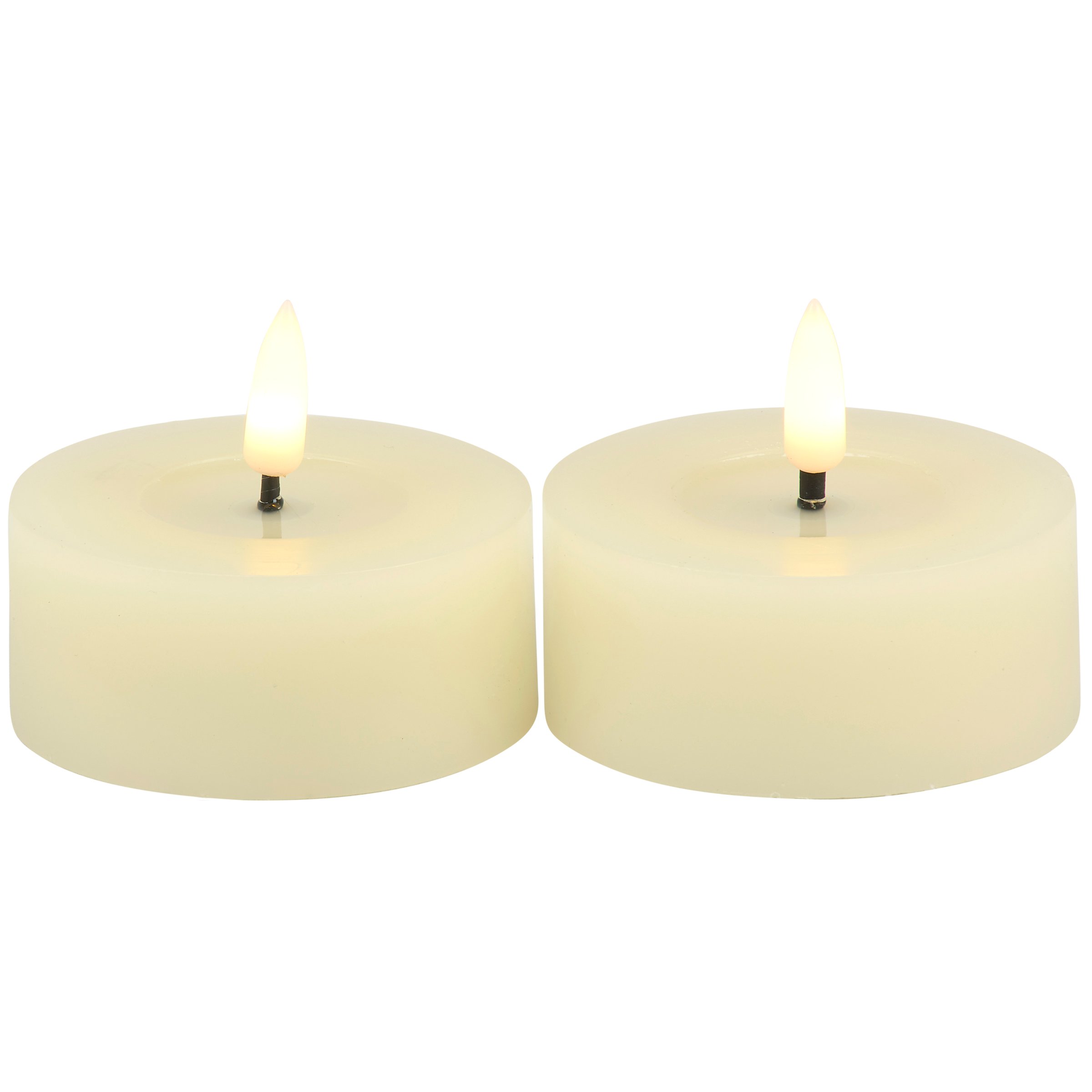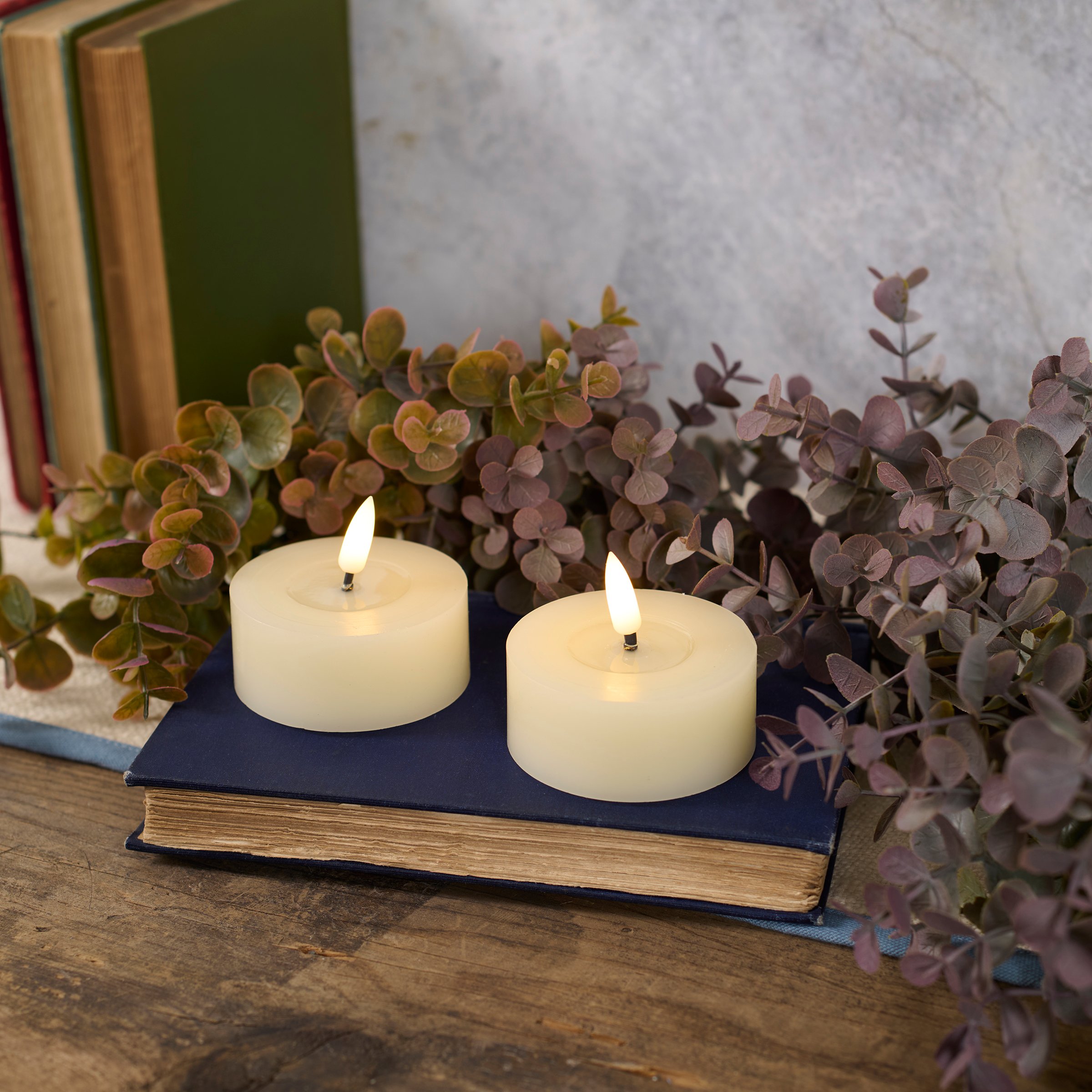 A set of 2 flameless candles from our Home Collection displaying tealight candle designs with melted wax details around the faux wicks. Each flameless candle features a light source resembling a small flame powered by 2 AAA batteries for each candle with convenient 6 hour timers. Batteries are not included. Our Tealight flameless candle set is packaged together in an acrylic box with product information to easily view items inside on store display. A set of candle accessories with a variety of options for adding mood lighting to any space.