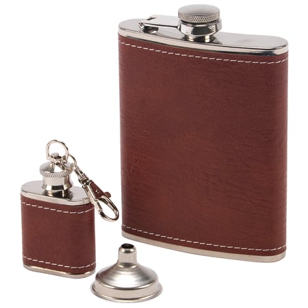 A stainless steel flask set from our Alcohol Collection displaying a stylish brown pebbled design. Flask set includes an 8 oz flask and 1 oz mini flask keychain each with a faux leather wrap as well as a funnel for easy refilling. Hand wash only. Our Brown Pebbled flask set come packaged in a box that neatly displays each item making it great for gifting. A stylish alcohol-themed gift perfect for an on-the-go accessory.