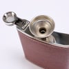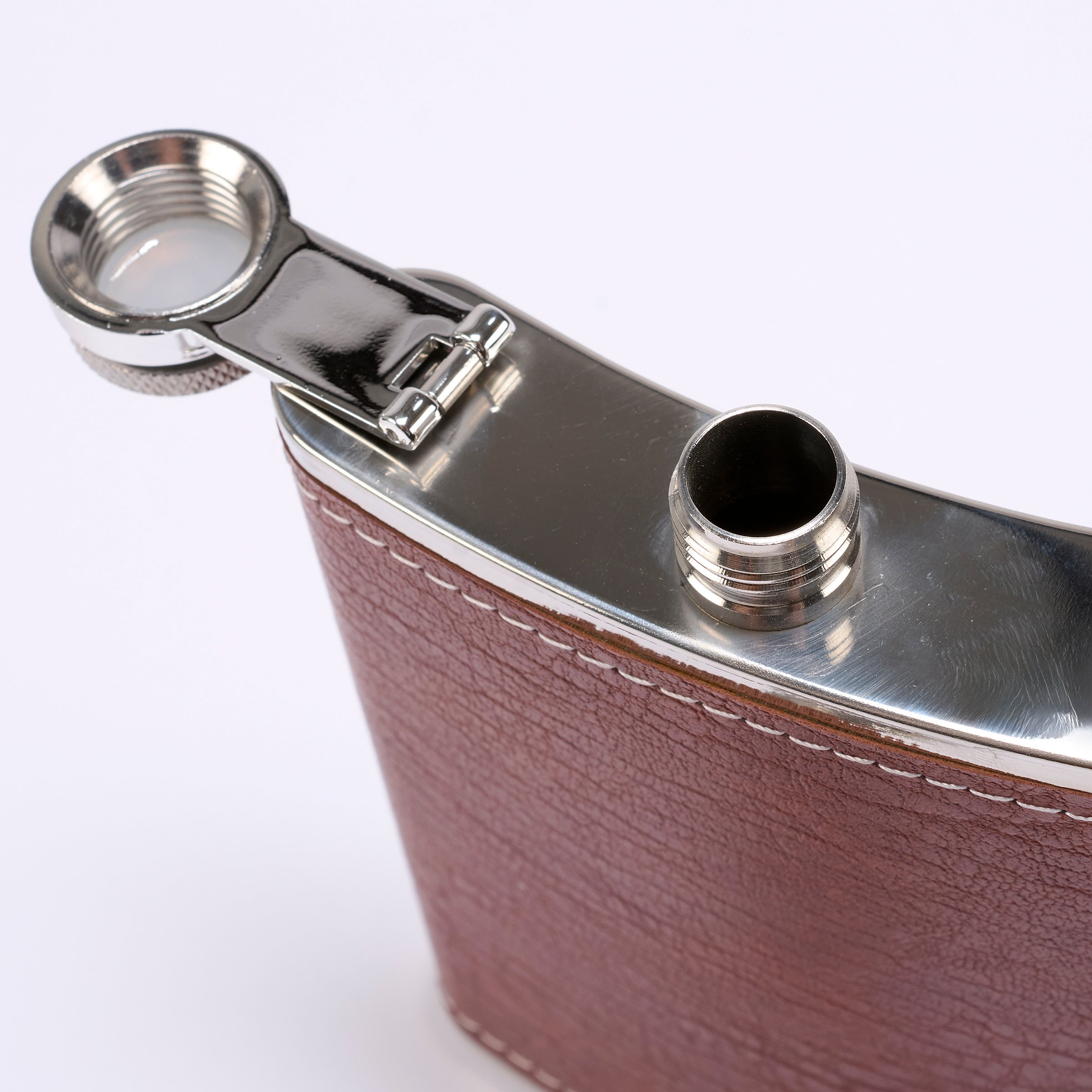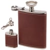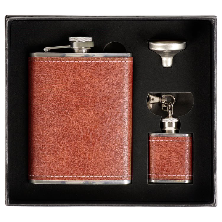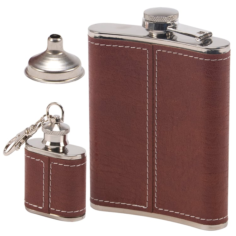 A stainless steel flask set from our Alcohol Collection displaying a stylish brown pebbled design. Flask set includes an 8 oz flask and 1 oz mini flask keychain each with a faux leather wrap as well as a funnel for easy refilling. Hand wash only. Our Brown Pebbled flask set come packaged in a box that neatly displays each item making it great for gifting. A stylish alcohol-themed gift perfect for an on-the-go accessory.