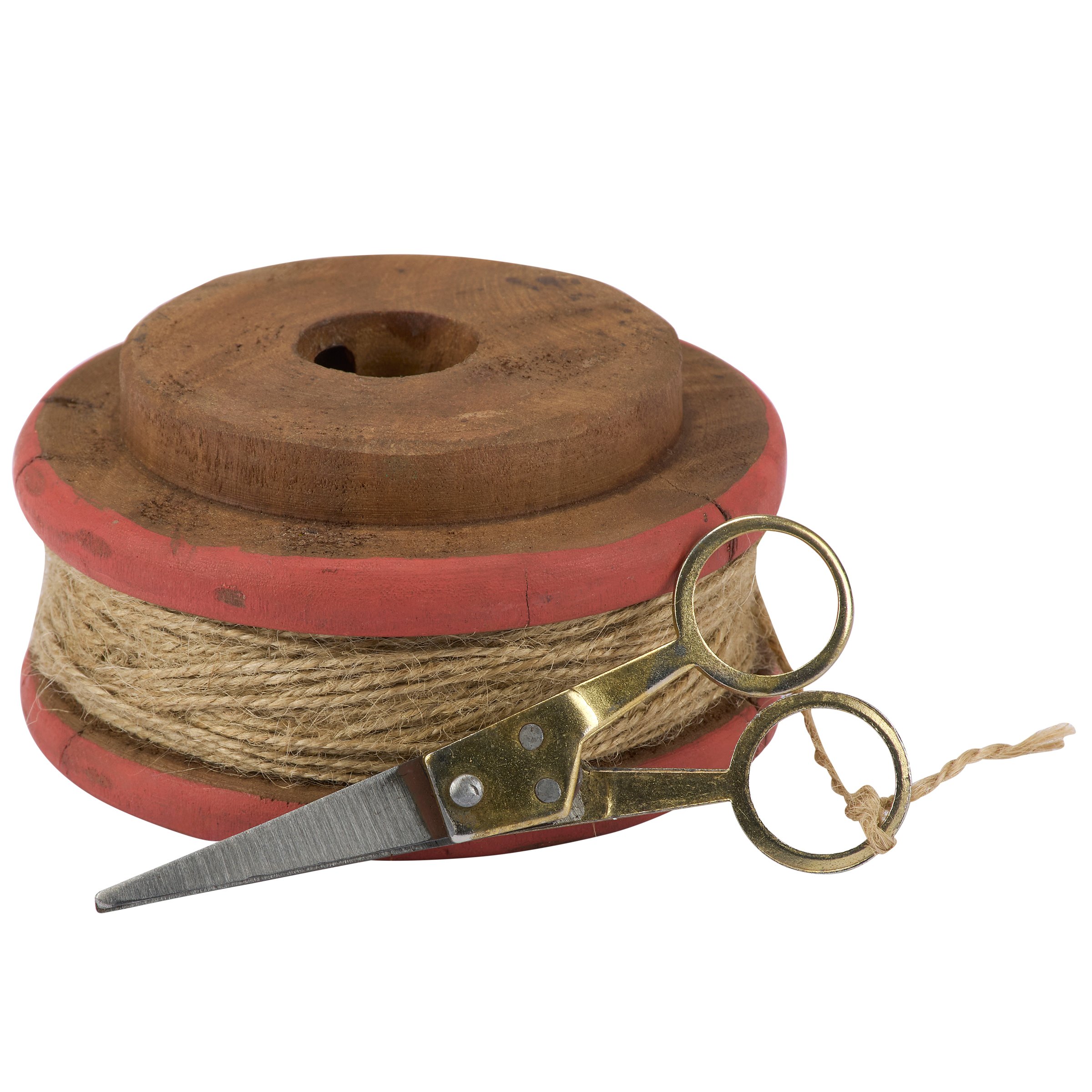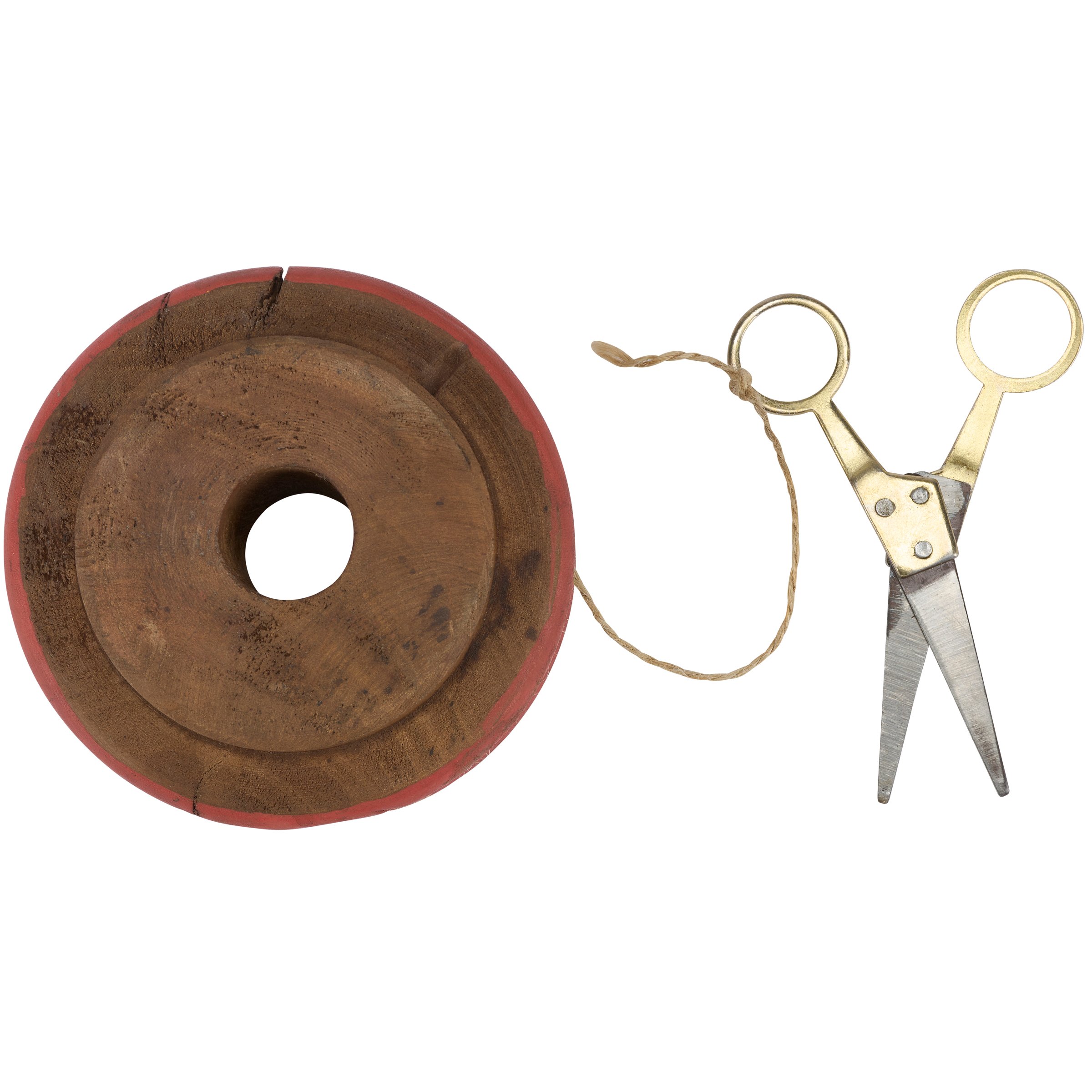 A decorative antique from our Primitive Collection displaying a flat wooden spool design wrapped with twine made from recycled antique items. Each antique flat twine spool features natural wood and metal scissors with distressed details for an aged appearance. This item is an authentic import from India making each piece unique with varying details like color, pattern, style, and size. Due to the method in which this item is made, we cannot guarantee similar details among multiple items. Our Flat Twine Spool is designed to free-stand on any flat surface for display. A rustic everyday home accent that can easily be added to any home or store display for a uniquely antique style. Displays well on its own but also coordinates with other items from our collection of decorative antiques.