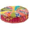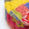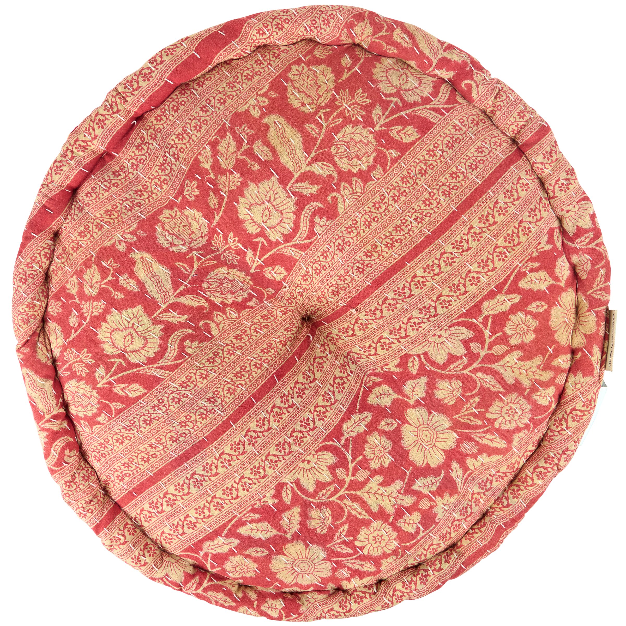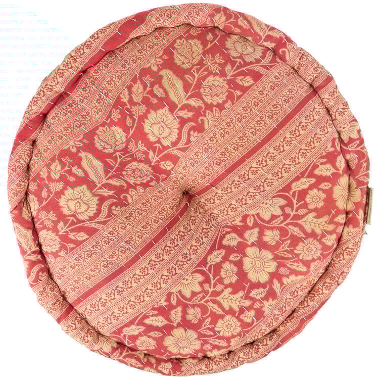 A sturdy cotton floor pillow from our Primitive Collection perfect for adding a fun and comfy seat anywhere in the home. Floor pillow displays a colorful Kantha design made by using various fabrics to give each design a unique combination of vibrant colors and beautiful patterns. While Kantha stitched placement and positioning may vary, patterns remain consistent between each unique pillow. Kantha floor pillow also features recycled cotton filling for a more eco-friendly home accent. Wipe clean with damp cloth. Our Round Kantha floor pillow is a stylish everyday home accent that adds functional style to any room.