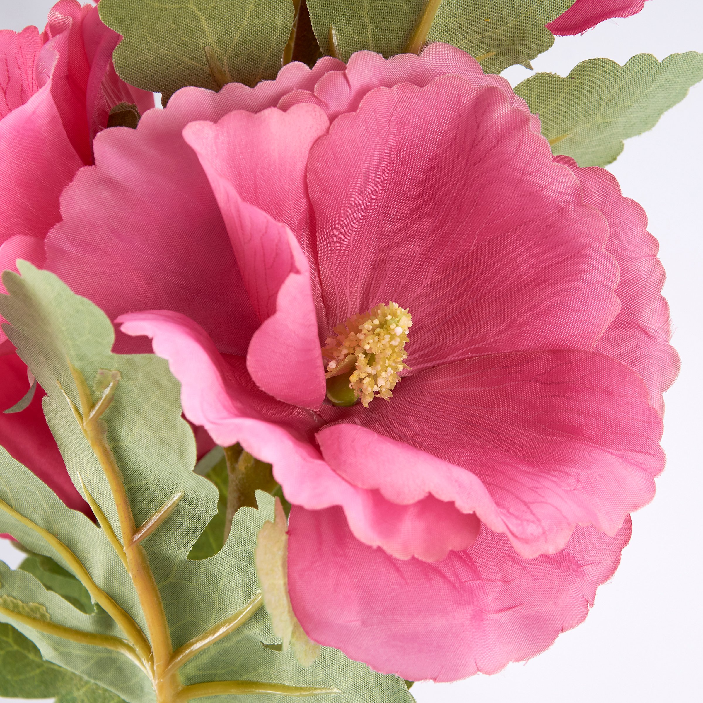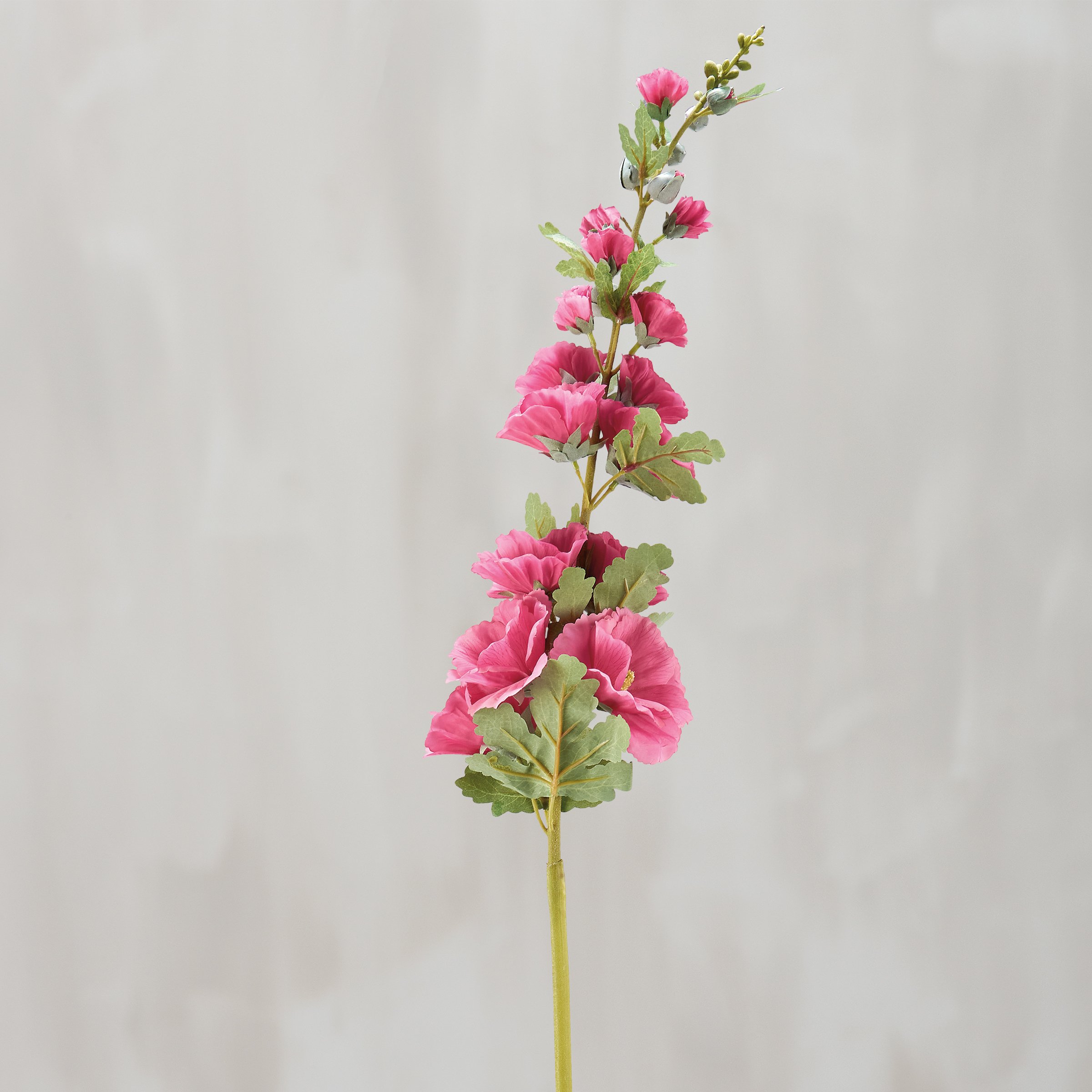 A pick of dark pink hollyhock with complementing greenery perfect for adding to any vessel. Faux plants bring botanical vibes to any space with zero maintenance. Pair with other faux botanicals to create a rich, natural display without the worry of withering away. Our Dark Pink Hollyhock floral pick stands 44.5 inches tall and complements well with décor from our Botanical Collection.