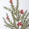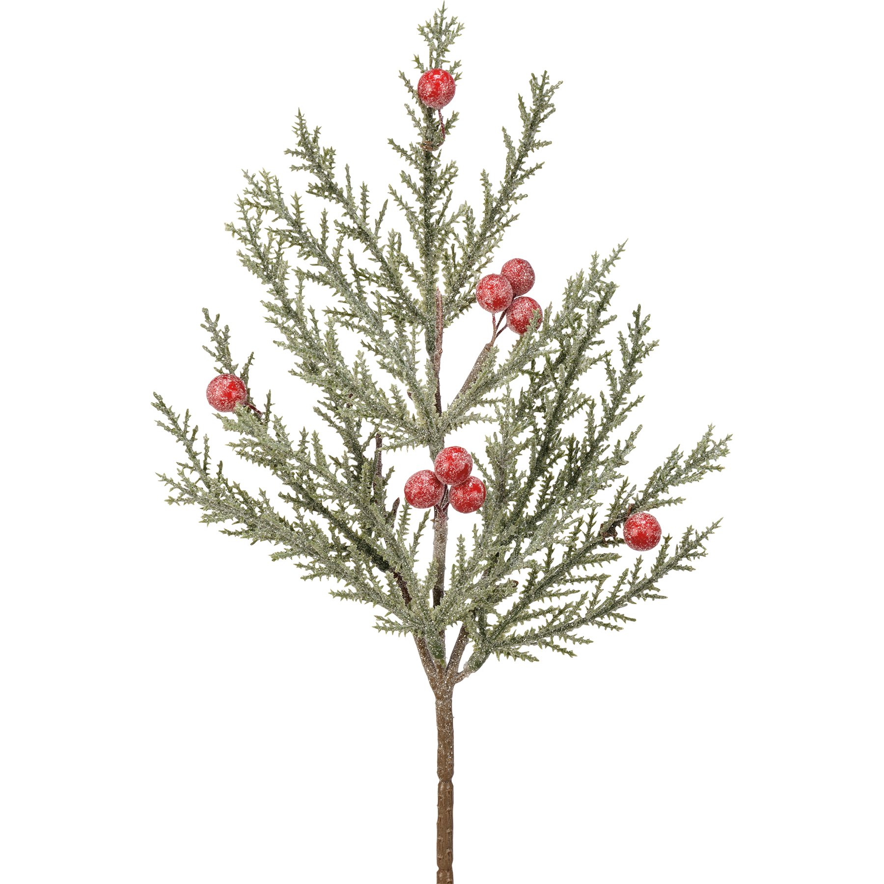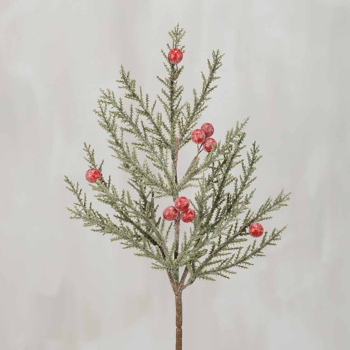 A pick featuring glittered pine berries. Our Glittered Pine Berries pick is packaged in a protective polybag.