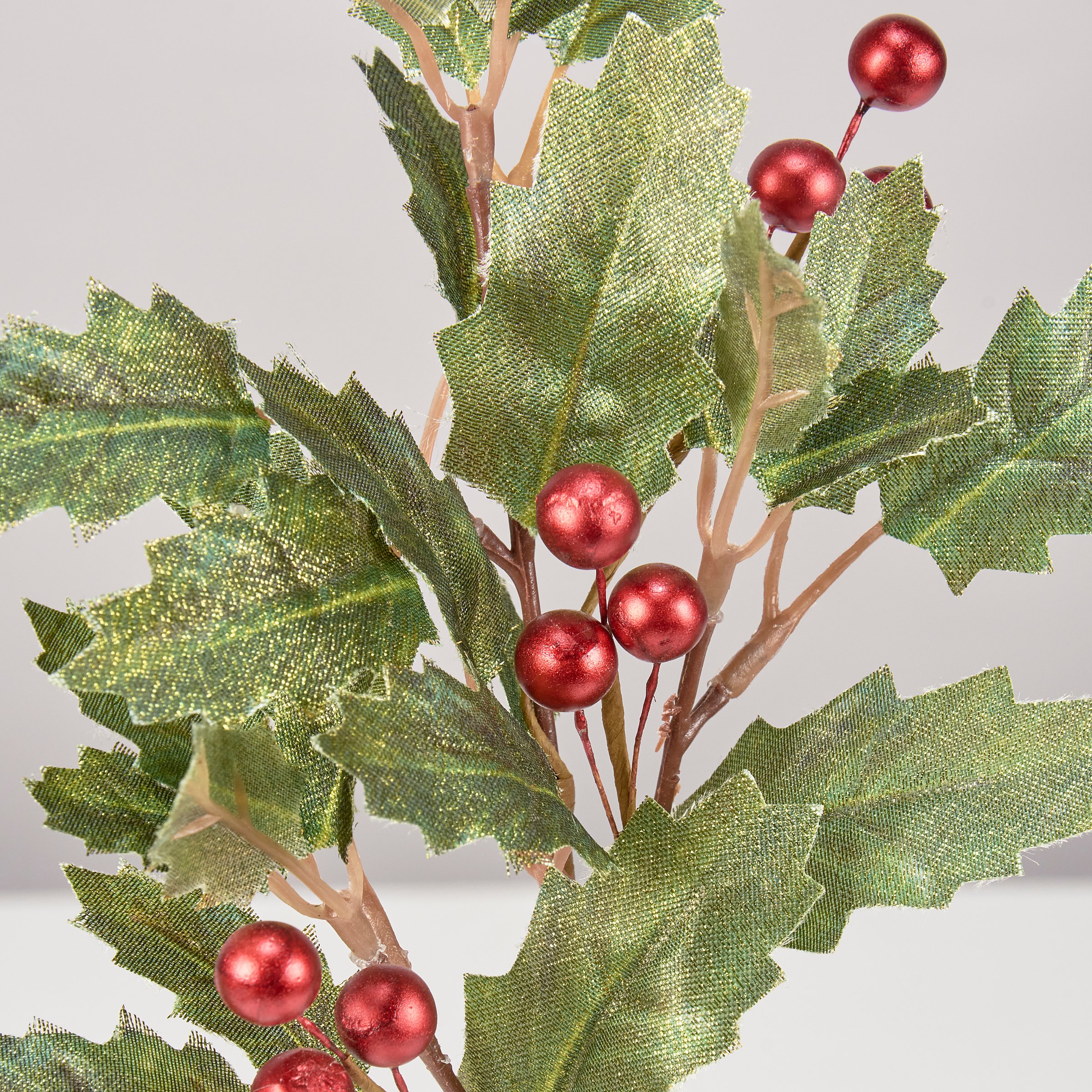 A winter greenery pick of holly leaves with glitter accents for a frosty finish perfect for adding to a seasonal vessel. Faux plants bring botanical vibes to any space with zero maintenance. Pair with other faux botanicals to create a rich, natural display without the worry of withering away. Our Holly Leaves pick stands 12 inches tall and complements well with décor from our Christmas Collection.