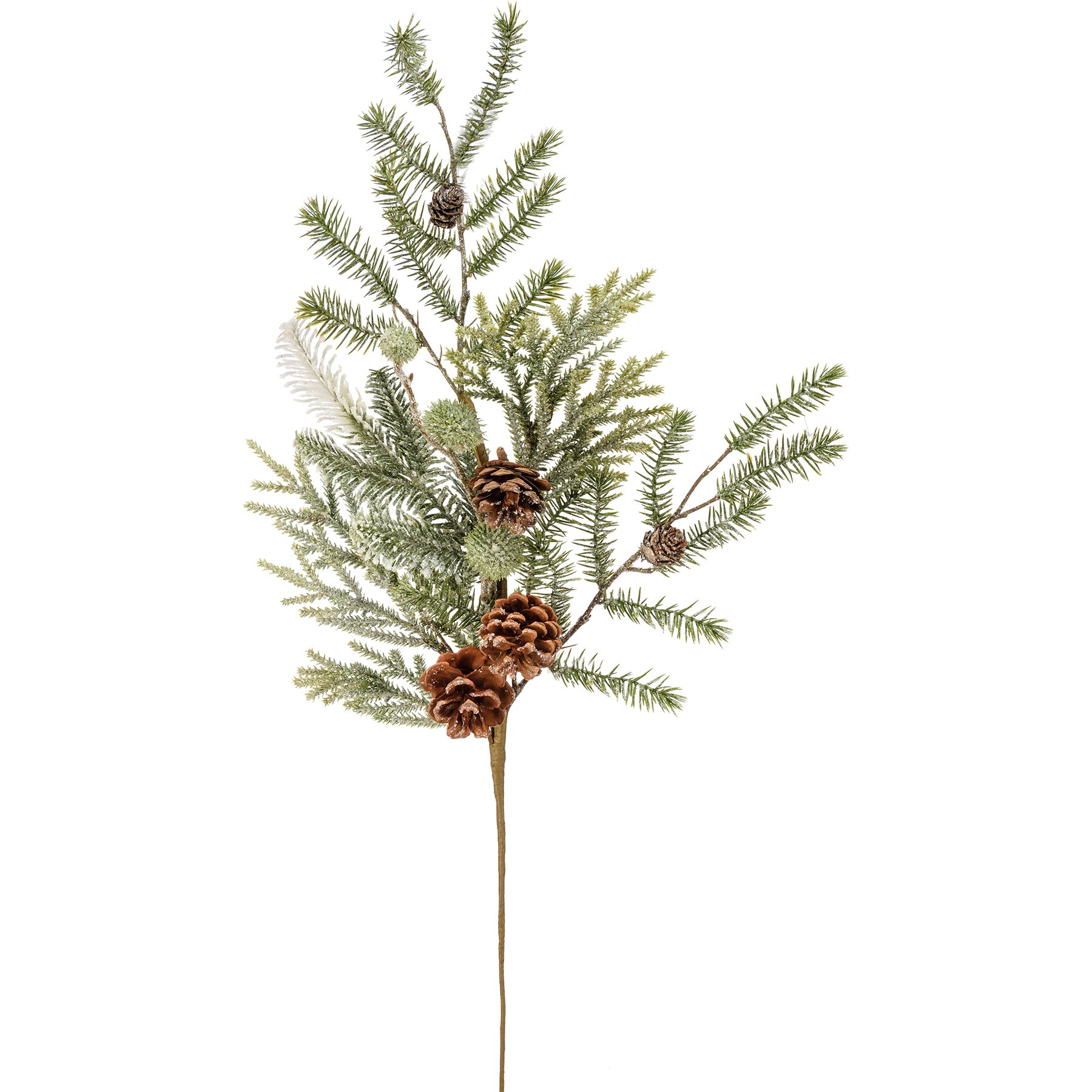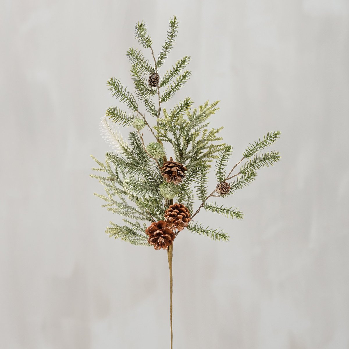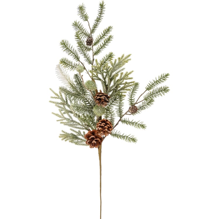 A mixed evergreen pick with pinecones and a glitter coating. 30" tall. Our Mixed Evergreens pick is packaged in a protective polybag.